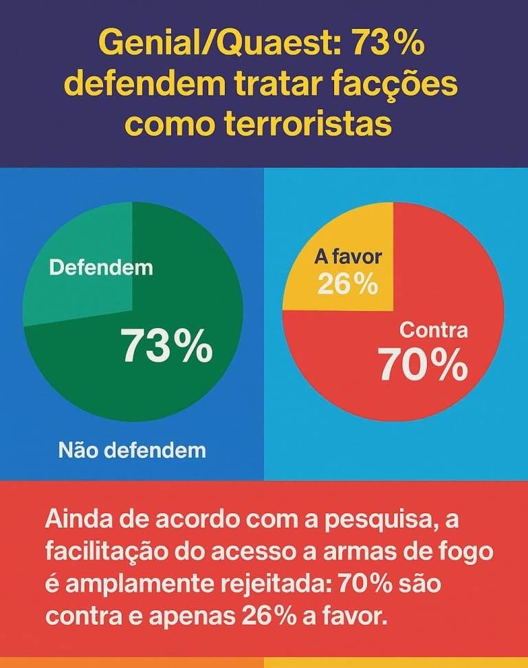 Pesquisa Genial/Quaest revela que 73% dos brasileiros defendem tratar facções criminosas como terroristas. Levantamento revela apoio a penas mais duras e rejeição à facilitação do acesso a armas de fogo.