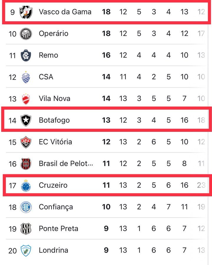 O Vasco está na 8ª posição, com 19. O Botafogo é o 14º, com 13. Já o Cruzeiro está na zona de rebaixamento, em 17º, com 11 pontos. Quem lidera a Série B é o Náutico, com 29. O Goiás fecha o G-4, com 23.