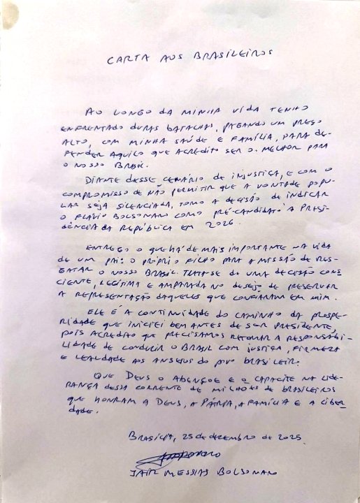 Horas antes de ser encaminhado ao centro cirúrgico, Bolsonaro divulgou a carta intitulada “Carta aos Brasileiros”, na qual declara apoio à pré-candidatura do filho, Flávio Bolsonaro, à Presidência da República em 2026.