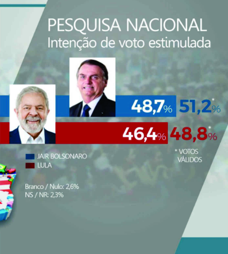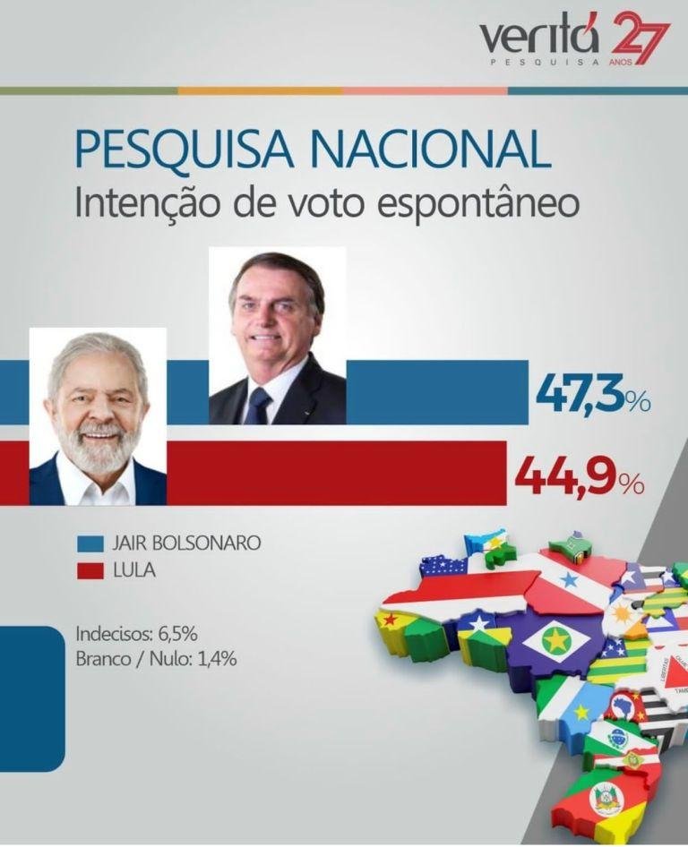 No levantamento divulgado neste domingo (16) pelo Instituto Veritá, Bolsonaro passa a frente e lidera com 51,2%, enquanto Lula aparece em 2º com 48,8% dos votos válidos.