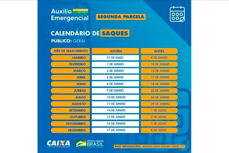 O segundo ciclo de pagamentos que estava marcado inicialmente para encerrar em 8 de julho, com a possibilidade de saques para os nascidos em dezembro, agora vai ser finalizado no dia 17 de junho.