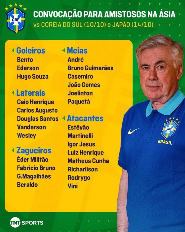 O técnico Carlo Ancelotti anunciou, na tarde desta quarta-feira (1°), a lista de convocados da Seleção Brasileira para os amistosos contra Coreia do Sul e Japão. Para esses compromissos da Data Fifa de outubro, 26 jogadores foram convocados. Apenas dois jogadores que atuam no futebol brasileiro foram chamados. A lista conta com retornos importantes, como Vini Jr e Rodrygo.