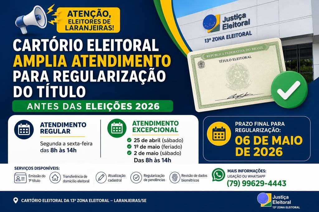 Os eleitores de Laranjeiras, em Sergipe, devem ficar atentos ao calendário da 13ª Zona Eleitoral para evitar pendências no cadastro eleitoral antes das Eleições 2026. O Cartório Eleitoral divulgou novo horário de funcionamento durante o período de fechamento do cadastro, além de datas de atendimento excepcional para reforçar os serviços à população.