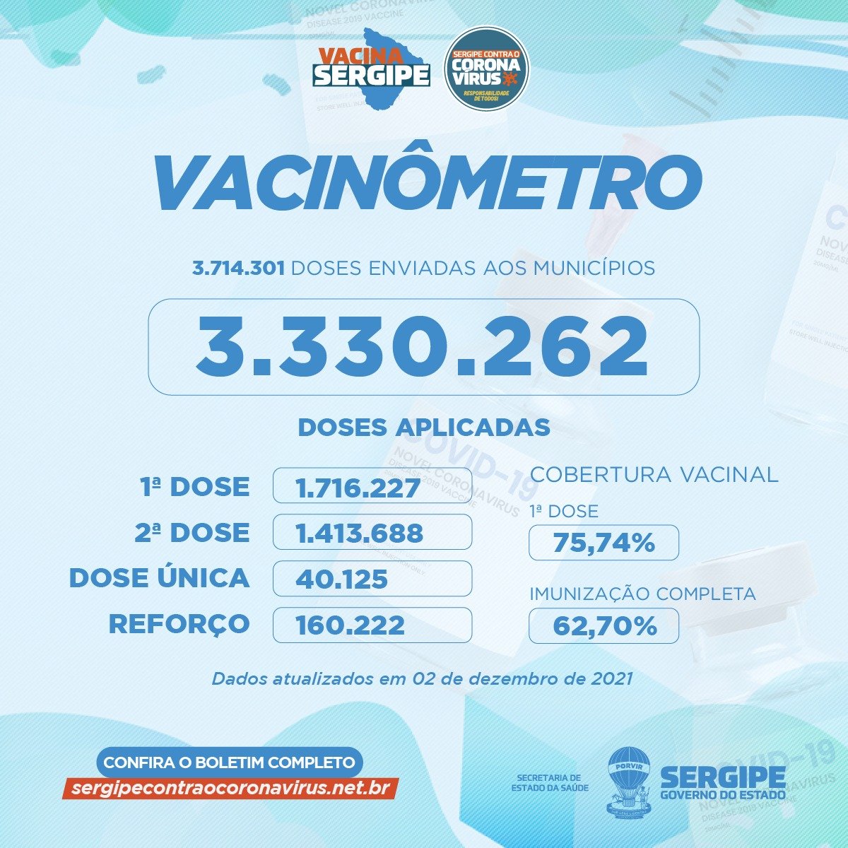 Foram enviadas aos municípios 3.714.301 doses. Destas, 1.716.227 foram aplicadas como primeira dose;  1.413.688 como segunda dose;  40.125 como dose única e 160.222 como dose de reforço. A cobertura vacinal de primeira dose está em 75,74% e 62,70% estão com a imunização completa.
