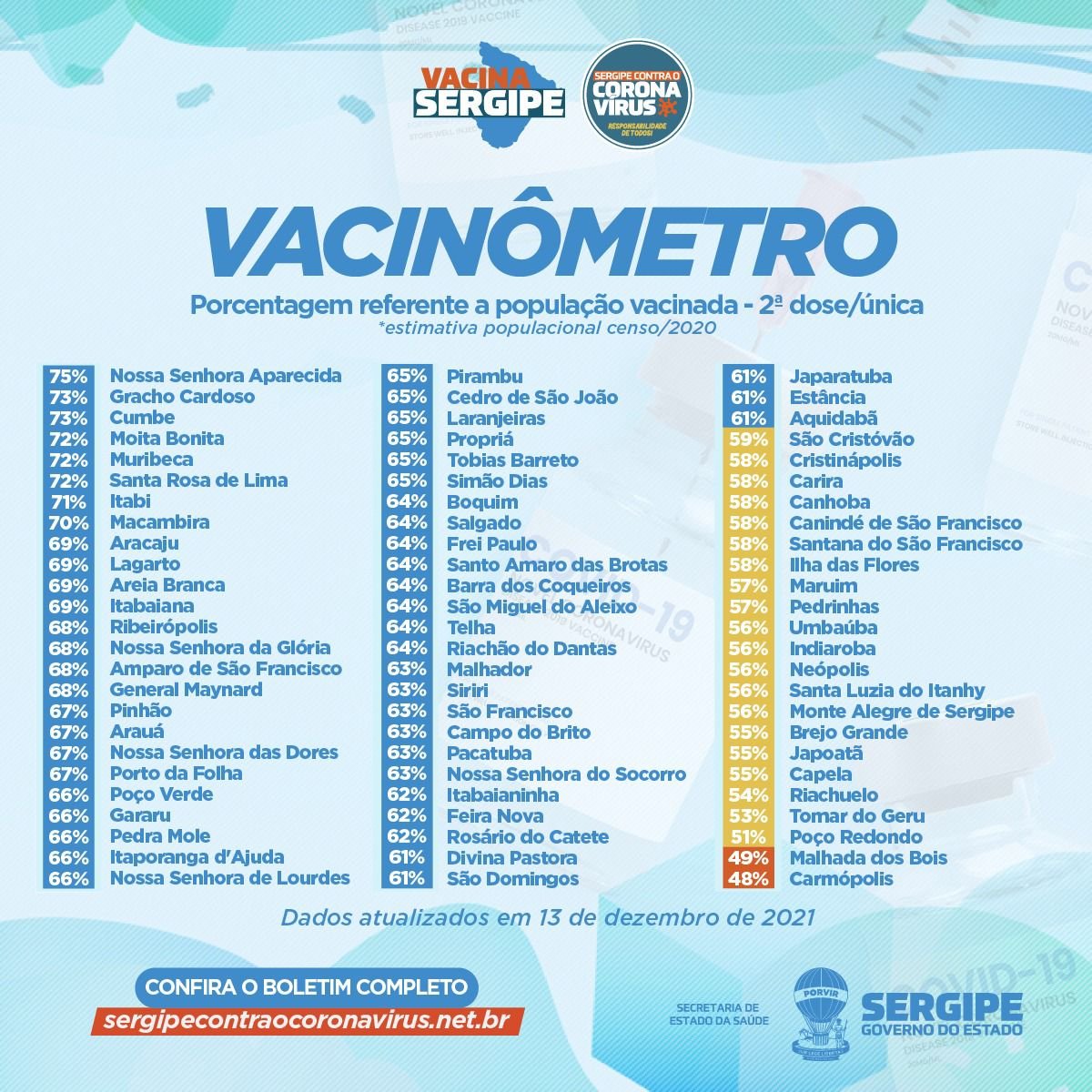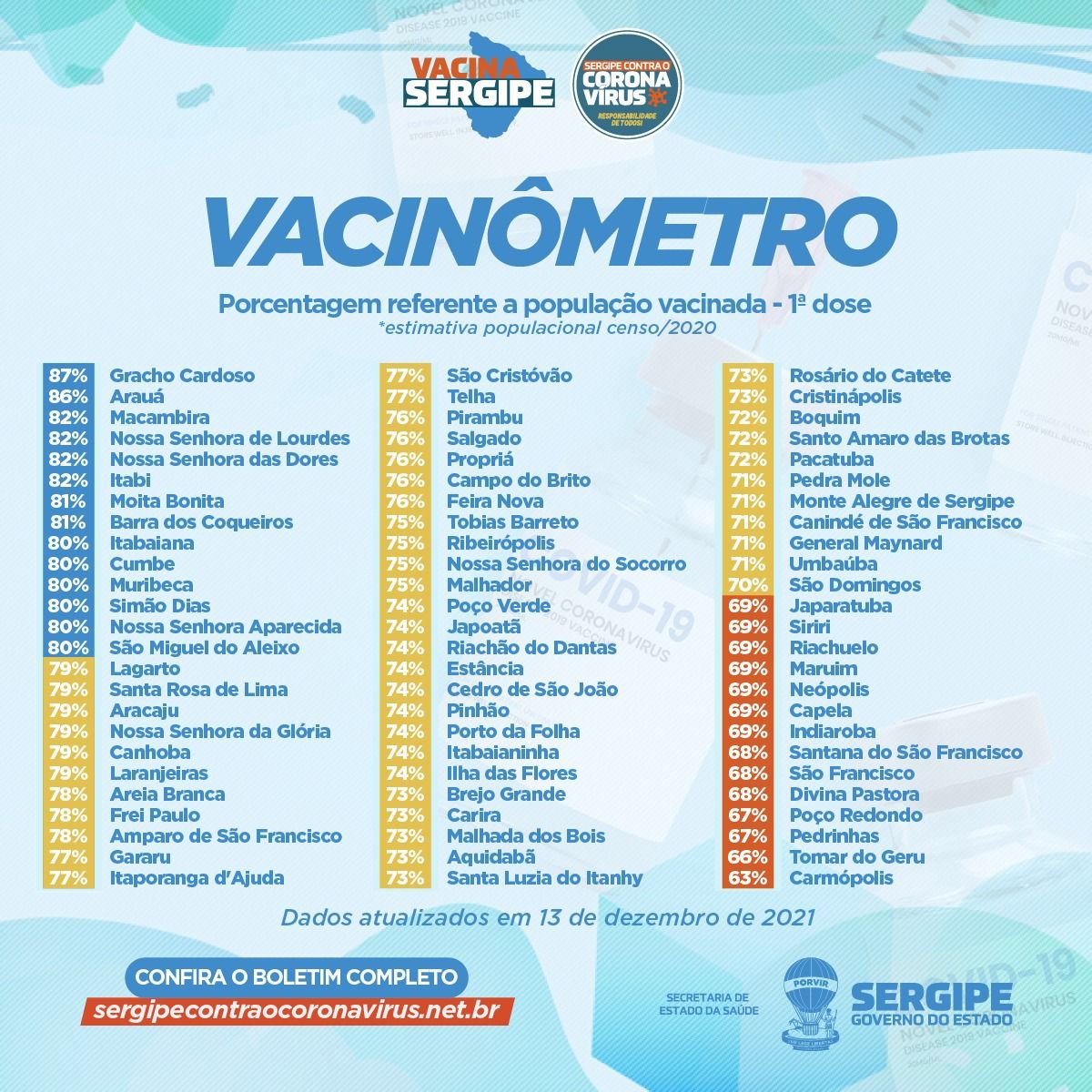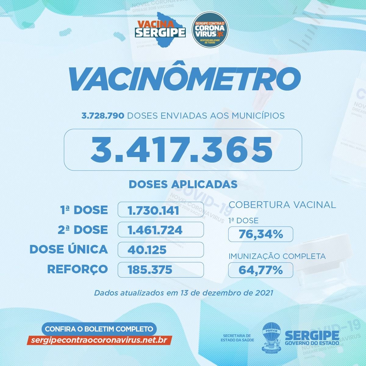 Foram enviadas aos municípios 3.728.790 doses. Destas, 1.730.141 foram aplicadas como primeira dose;  1.461.724 como segunda dose;  40.125 como dose única e 185.375 como dose de reforço. A cobertura vacinal de primeira dose está em 76,34% e 64,77% estão com a imunização completa.