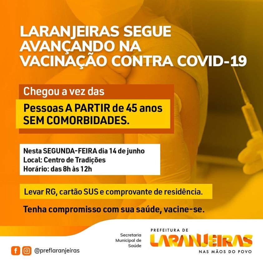 A Prefeitura de Laranjeiras através da Secretaria de Saúde e Bem Estar Social inicia nesta segunda-feira, 14, a vacinação das pessoas com idade a partir de 45 anos, sem comorbidades. A vacinação será realizada no Centro de Tradições, onde funciona o ponto fixo de vacinação em Laranjeiras. O horário de funcionamento é das 8h às 12h.