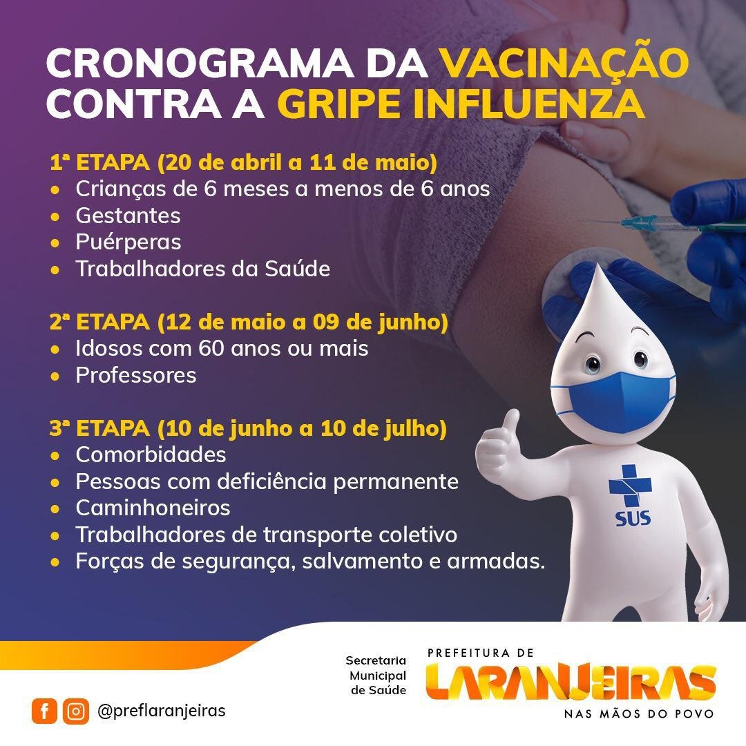 A vacinação contra a gripe continua sendo realizada no mesmo local, seguindo as informações do calendário descritas no card abaixo: