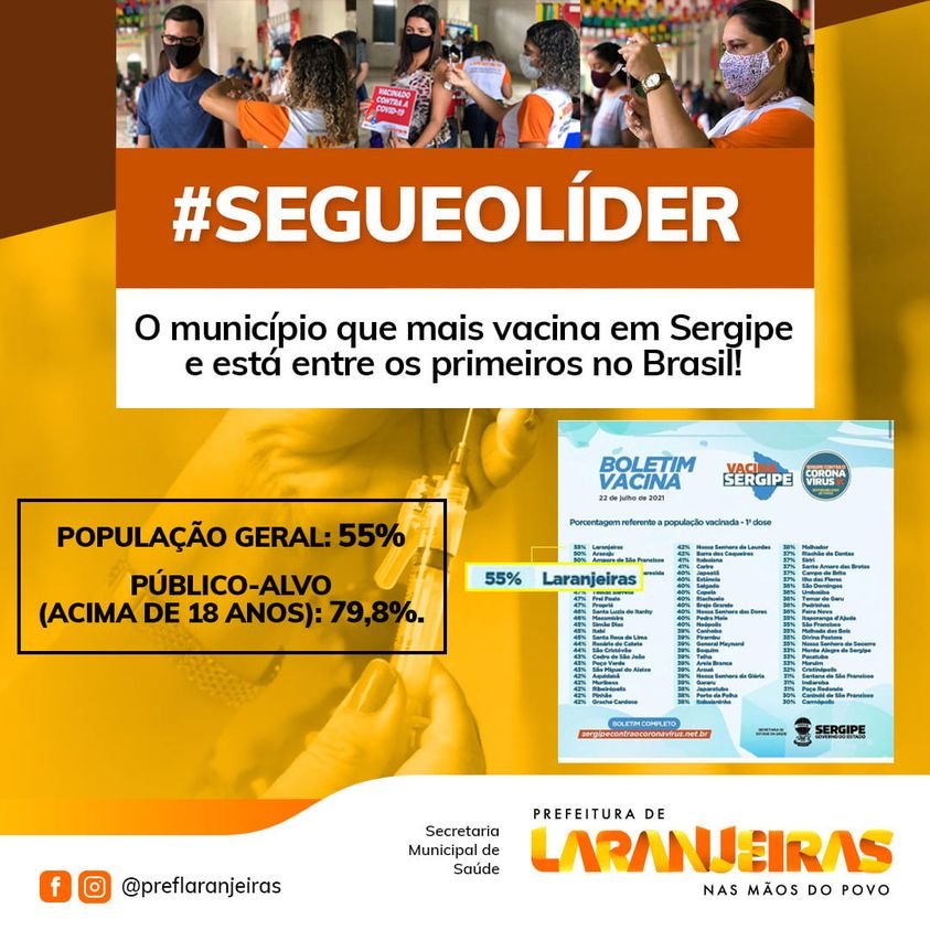 O gestor ainda destacou que “mais uma vez, o Governo de Sergipe divulga o boletim de vacinação e Laranjeiras se destaca como o município que mais vacina no Estado e aparece também como um dos primeiros colocados no Brasil. Em compromisso a você, vamos continuar administrando a cidade com responsabilidade, transparência, por que valorizamos a vida de cada laranjeirense”, pontuou Juca.