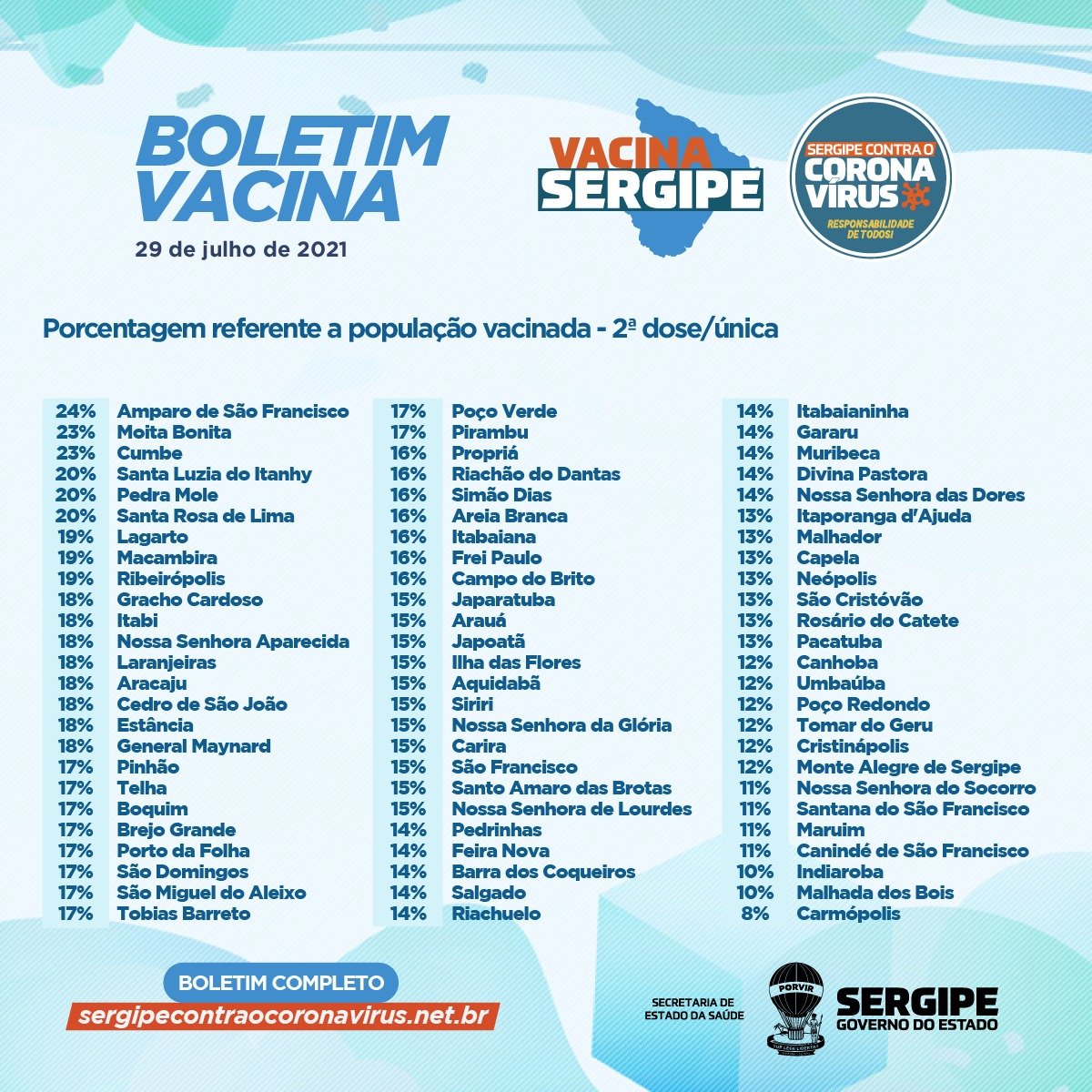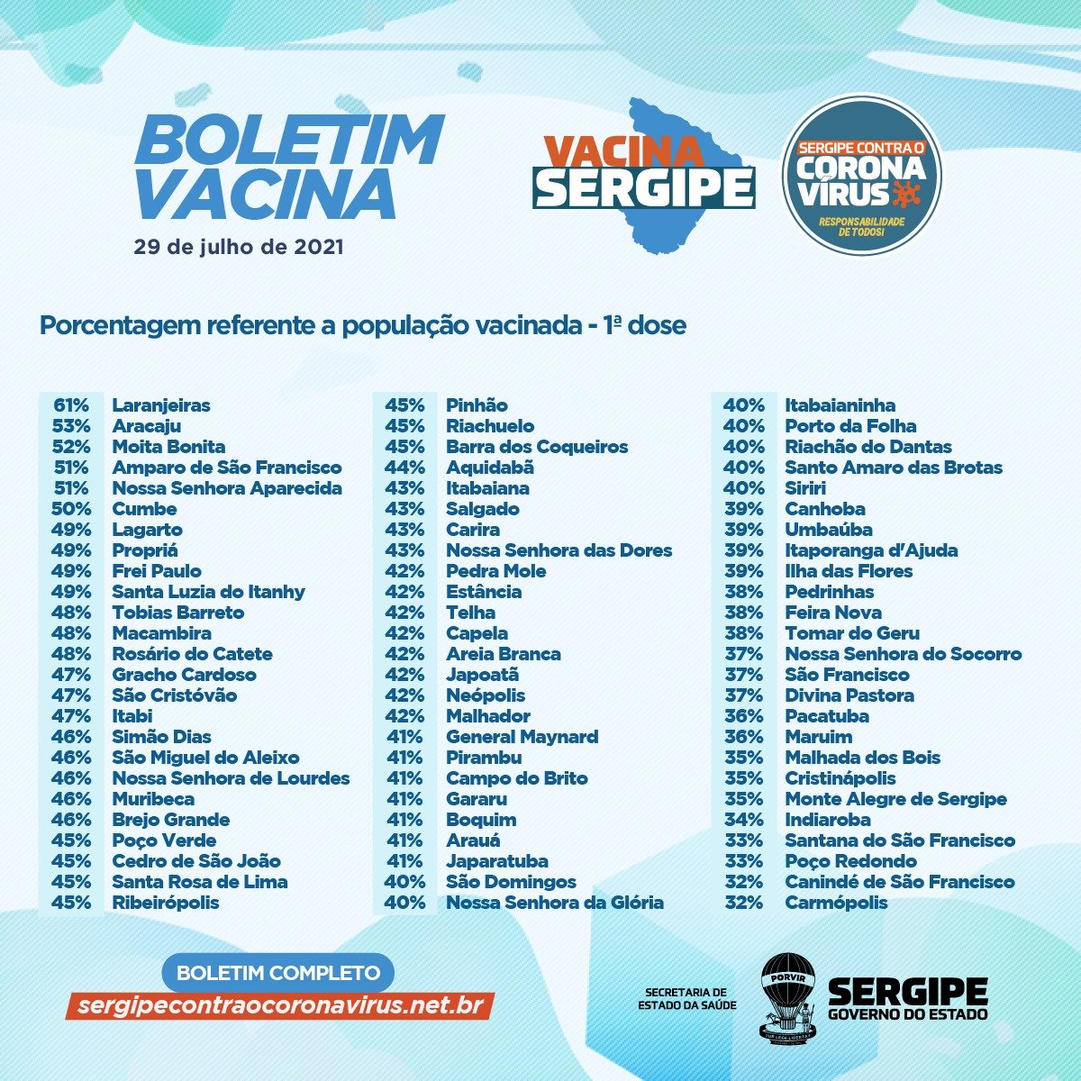 Conheça mais detalhes sobre o novo boletim epidemiológico da Covid-19 em Sergipe. O município de Laranjeiras continua em primeiro lugar na aplicação da 1ª dose da vacina contra a Covid-19. Confira abaixo no card!