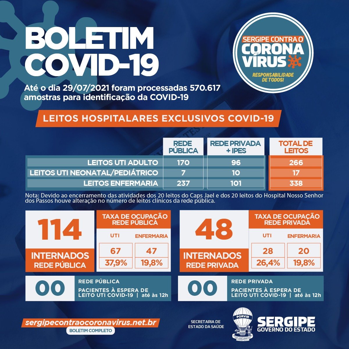 A Secretaria de Estado da Saúde (SES) divulgou nesta quinta, 29, o boletim epidemiológico do coronavírus com 234 casos, uma morte nesta quinta e três mortes que estavam em investigação e foram confirmados. Em Sergipe, 273.863 pessoas já testaram positivo para a Covid-19 e 5.907 morreram. Até o momento, 263.362 pacientes foram curados.