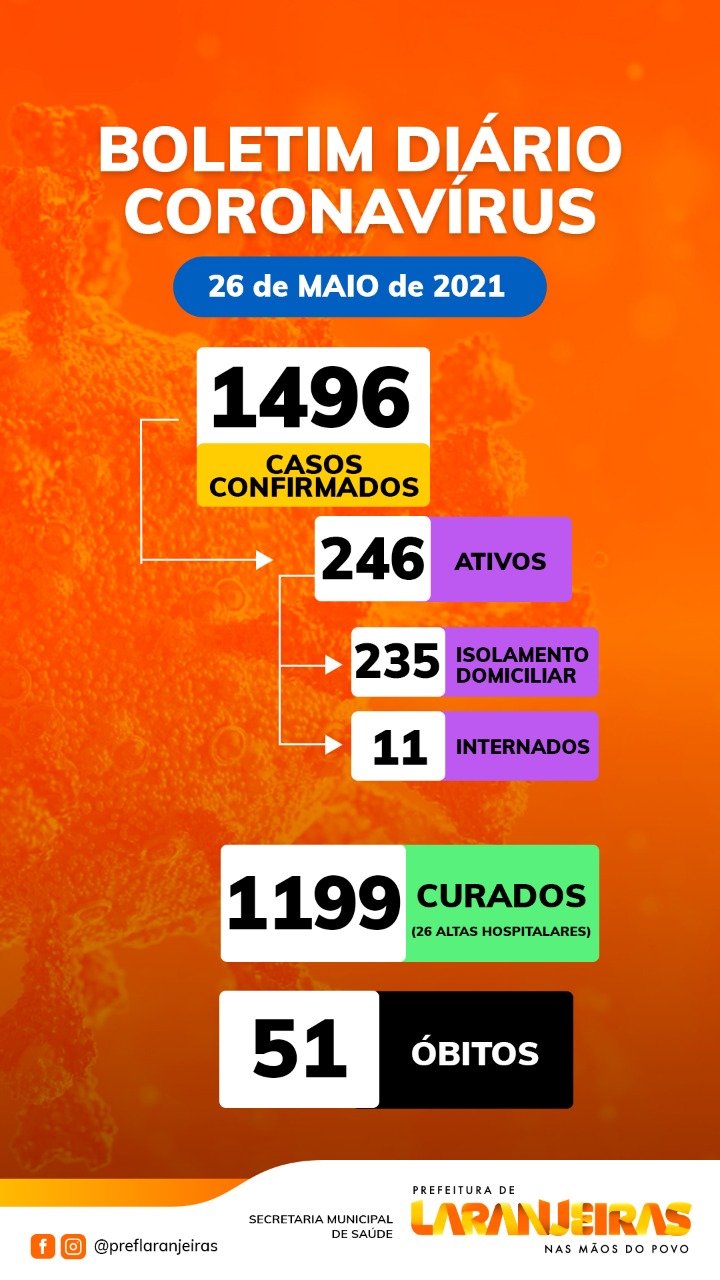 Além dos 1.111 casos de Covid-19 também foram registrados mais cinco óbitos nesta quarta. Somando a mais 22 óbitos que estavam em investigação, totalizam 27 mortes. Veja também os números de Laranjeiras em relação à pandemia da Covid-19.