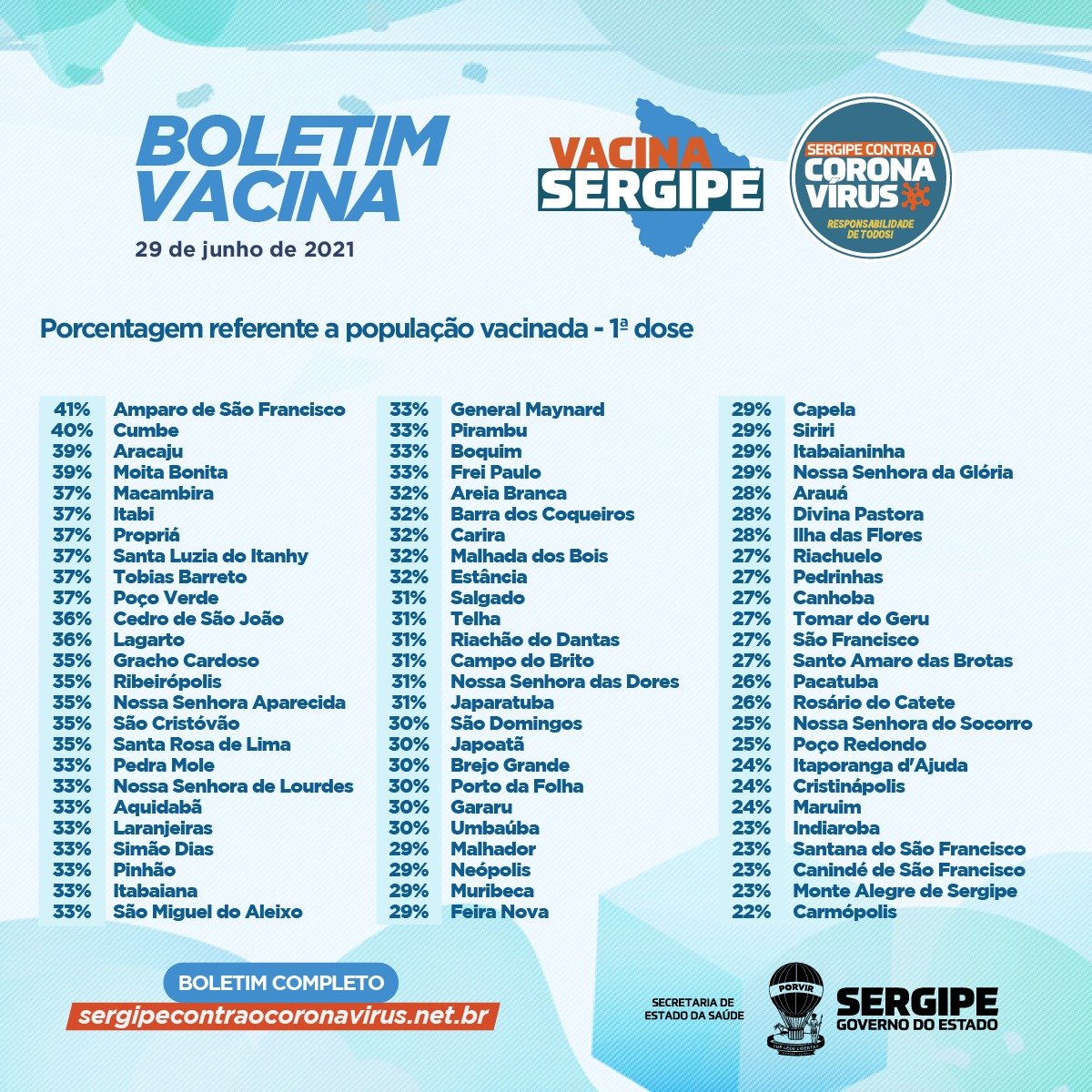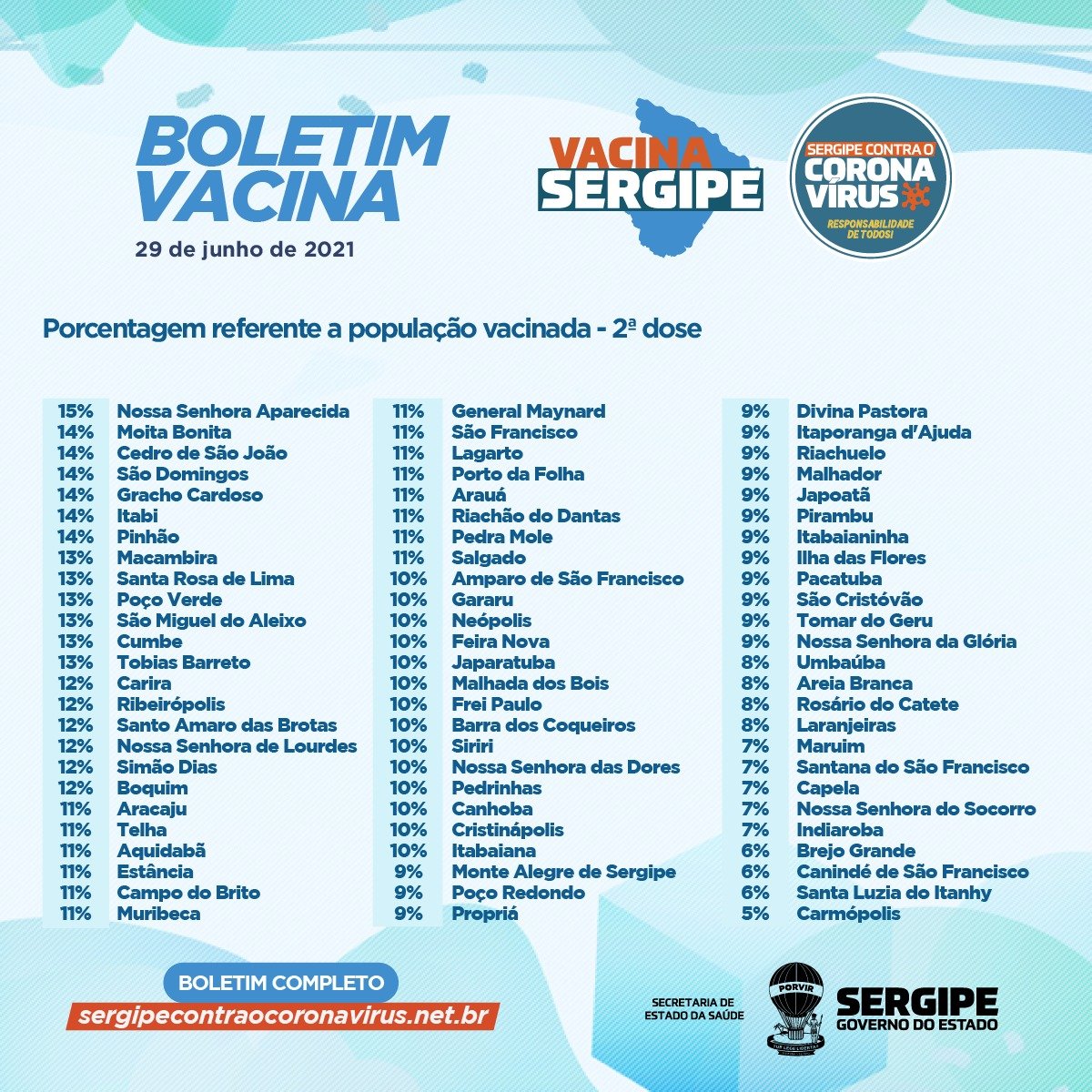 As 17 mortes foram: uma mulher, 84 anos, de Aracaju, sem comorbidade; uma mulher, 86 anos, de Simão Dias, com doença neurológica crônica; um homem, 52 anos, de Aracaju, sem comorbidade; uma mulher, 67 anos, de Japaratuba, com hipertensão; um homem, 80 anos, de Lagarto, sem comorbidade; um homem, 83 anos, de Poço Verde, com hipertensão; uma mulher, 36 anos, de Riachuelo, com hepatopatia crônica; um homem, 70 anos, de Nossa Senhora do Socorro, sem comorbidade; um homem, 65 anos, de Malhada dos Bois, com doença pulmonar obstrutiva crônica; uma mulher, 43 anos, de Nossa Senhora do Socorro, sem comorbidade; um homem, 47 anos, de Aracaju, com diabetes e obesidade; uma mulher, 35 anos, de Aracaju, sem comorbidade; um homem, 64 anos, de Itabaiana, com obesidade e diabetes; um homem, 49 anos, de Ribeirópolis, sem comorbidade; uma mulher, 70 anos, de Salgado, com acidente vascular encefálico e insuficiência renal aguda; um homem, 69 anos, de Itabaianinha, sem comorbidade; uma mulher, 60 anos, de Campo do Brito, com diabetes.
