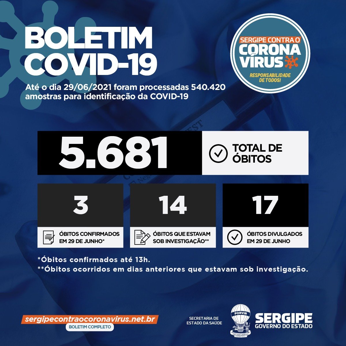 A Secretaria de Estado da Saúde (SES) divulga nesta terça, 29, o boletim epidemiológico do coronavírus, com 350 casos, três óbitos nesta terça e 14 mortes que estavam em investigação e foram confirmadas. Em Sergipe, 263.114 pessoas já testaram positivo para a Covid-19 e 5.681 morreram. Até o momento, 244.013 pacientes foram curados.