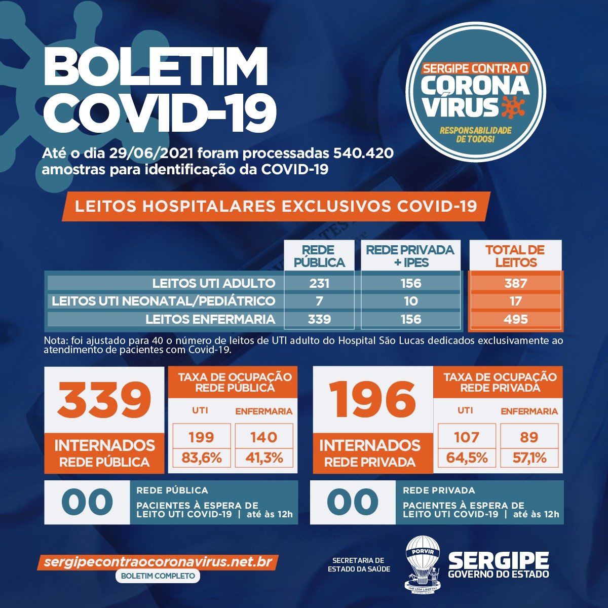 Foram realizados 540.420 exames e 277.306 foram negativados. Estão internados 535 pacientes, sendo que no serviço público são 198 em leitos de UTI (adulto), um na UTI neonatal/ pediatria e 140 em leitos clínicos (enfermaria), totalizando 339. Já nos leitos do serviço privado estão internados 107 pessoas na UTI adulta, zero na UTI neonatal/ pediatria e 89 em leitos clínicos, totalizando 196. São investigados mais três óbitos. Ainda aguardam resultados 702 exames coletados.