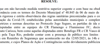 “Indicar que em não havendo medida restritiva superior cogente e com base na obediência e em consonância com os termos do Decreto Municipal nº 48.845 de 06 de maio de 2021, e ainda, em rigorosa e estrita observância das regras sanitárias preconizadas para o combate à disseminação da Covid-19, estabelecidas pelas autoridades municipais e complementadas pelas diretrizes e normas descritas no Protocolo Jogo Seguro, as partidas de ida e volta a serem disputadas entre as equipes do CR Flamengo e Fluminense FC, decisivas do Campeonato Carioca, bem como aquelas disputadas entre Botafogo FR e CR Vasco da Gama, decisivas pela Taça Rio, poderão contar com a presença de público nos limites a serem definidos em Reuniões de Segurança que acontecerão no dia 12/05/2021, às 14h e 14:30h, respectivamente, e cujos Planos de Ação e Contingências serão devidamente publicizados. A avaliação quanto a possibilidade de presença de público em partidas da Taça Rio estará diretamente vinculada à realização dos jogos no estádio do Maracanã, caso este seja o desejo dos clubes envolvidos, considerando que o referido estádio, no momento, é o único que encaminhou um plano de ação e contingência adequado para receber disputas contando com a presença de torcedores”, diz a resolução assinada pelo diretor de competições da FERJ, Marcelo Vianna.