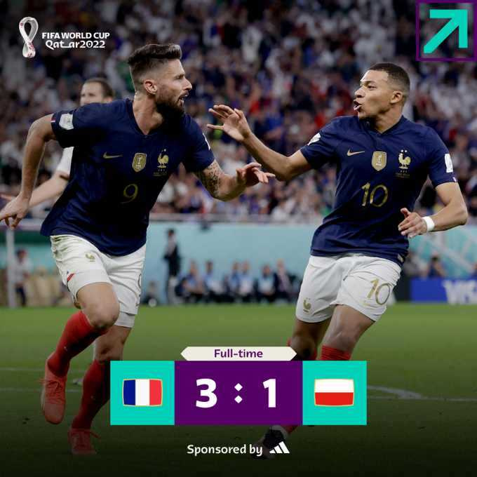 A França conquista classificação para as quartas de final da Copa do Mundo do Catar, após vencer a Polônia neste domingo.