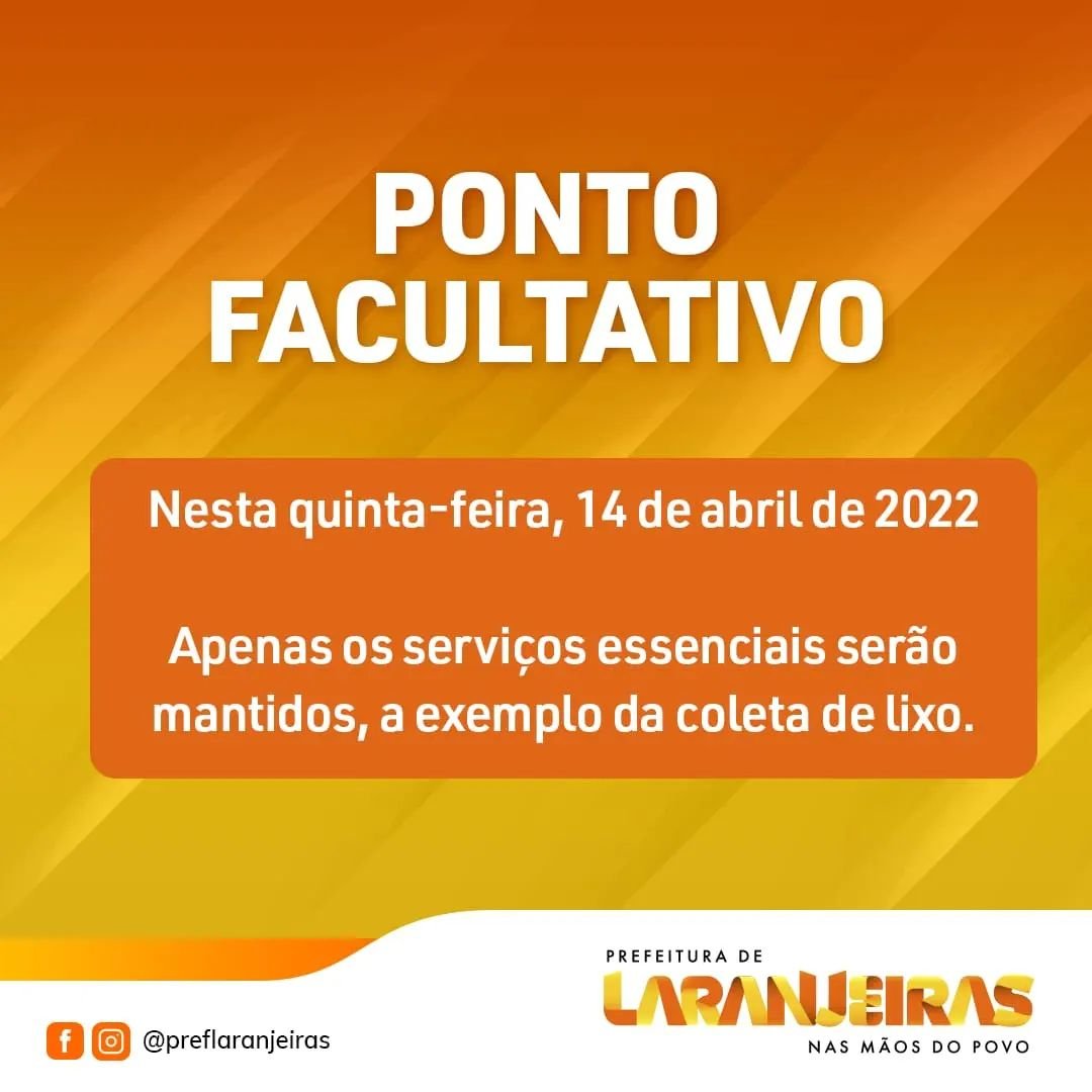 Por conta do ponto facultativo, os órgãos que compõem a administração municipal em Laranjeiras estarão com suas atividades suspensas na quinta-feira.