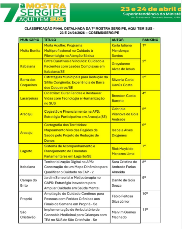 De acordo com a classificação oficial, o município ficou entre os melhores colocados em uma disputa que reuniu 88 trabalhos inscritos de diversas cidades sergipanas. Apenas os projetos com maior pontuação avançaram para a etapa seguinte.