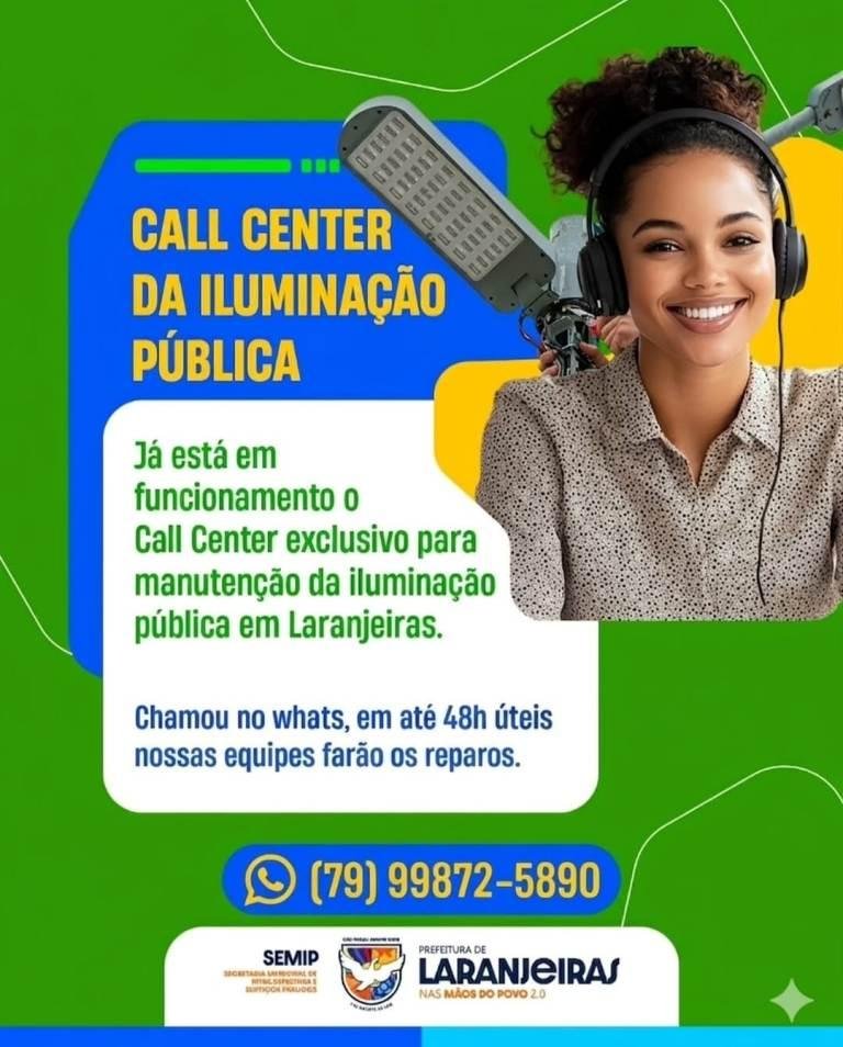 A Prefeitura de Laranjeiras implantou um call center exclusivo para atendimento de demandas relacionadas à iluminação pública. O serviço já está em funcionamento e permite que moradores solicitem reparos de forma rápida para problemas como lâmpadas apagadas, pontos escuros e falhas em luminárias nas vias da cidade.