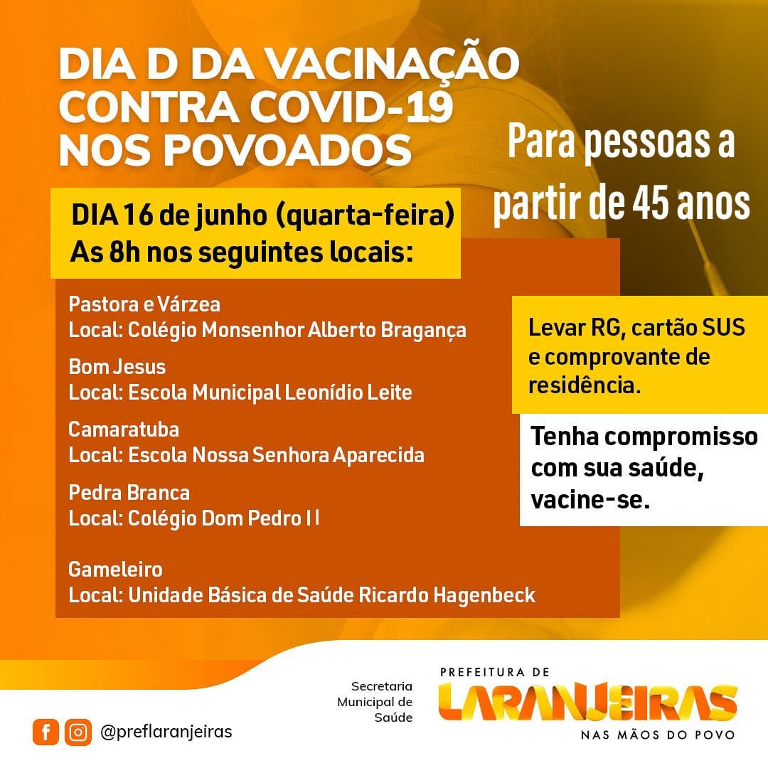 Para evitar aglomerações, permitir mais comodidade à população e acelerar a imunização, a Prefeitura de Laranjeiras irá realizar nesta quarta-feira, 16, o Dia “D” de Vacinação contra a Covid-19, nos bairros e povoados. Fique atento ao cronograma;