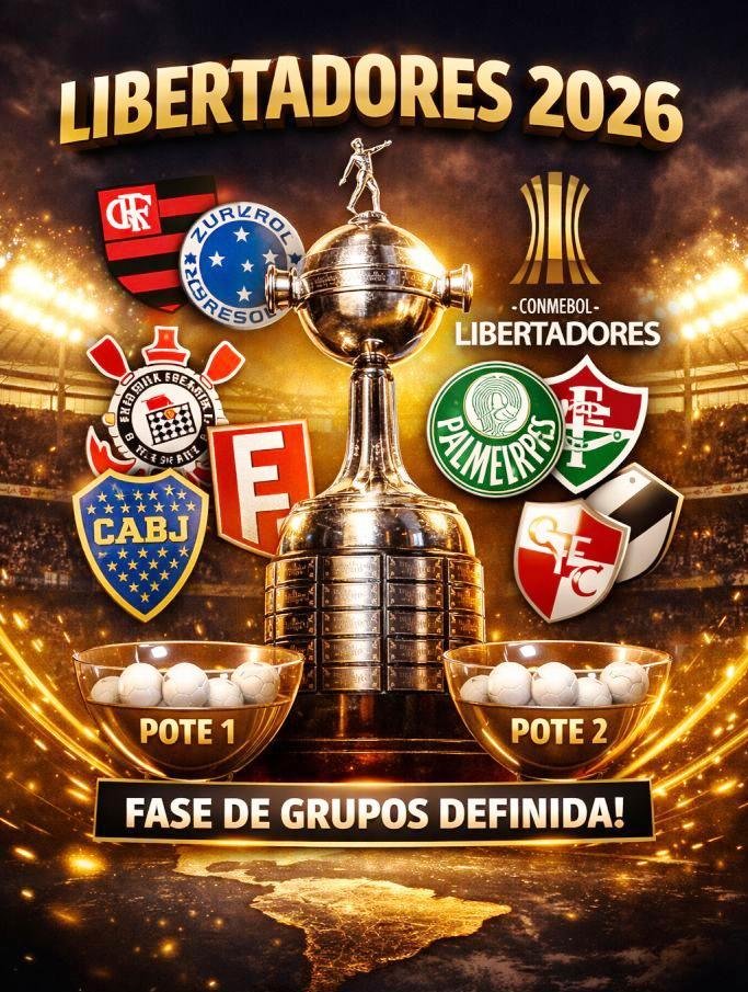 Já o Cruzeiro terá um dos desafios mais difíceis, dividindo grupo com o Boca Juniors, enquanto o Corinthians enfrentará um cenário competitivo ao lado de Peñarol e equipes sul-americanas tradicionais.