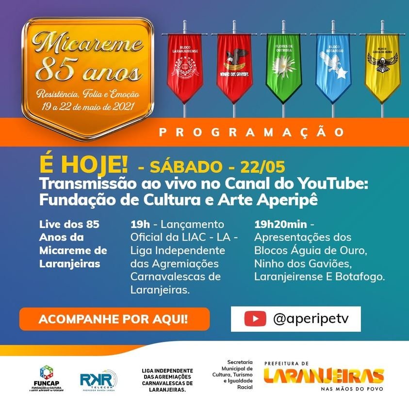 A Prefeitura de Laranjeiras realiza hoje o desfile dos blocos da Micareme. A live começa às 19h pelo canal do YouTube APERIPETV. você não pode perder esse evento tão tradicional em Laranjeiras.