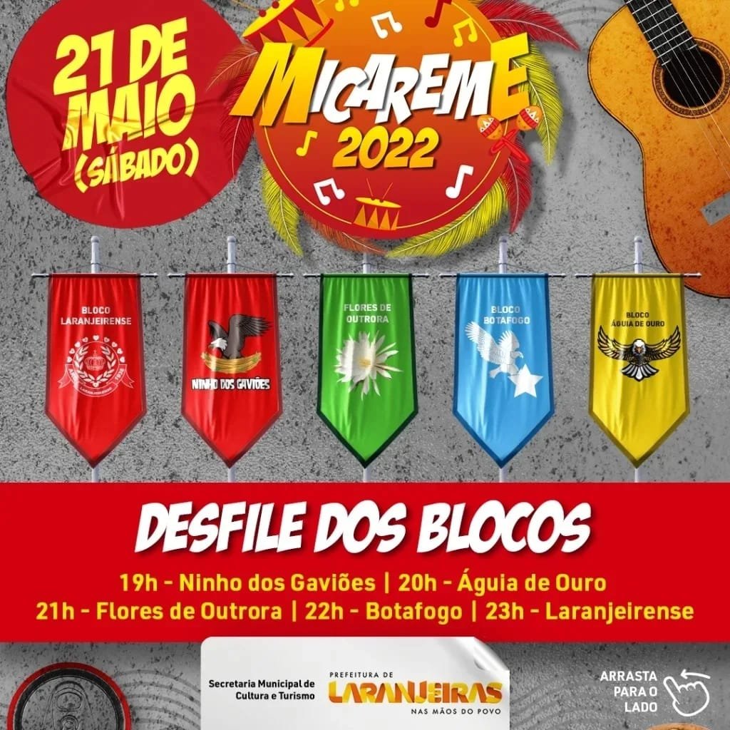 Amanhã e domingo, o município de Laranjeiras celebra a tradicional Micareme, carnaval fora de época que acontece há 86 anos, como muitas curiosidades, história e cultura. Este ano, a festa volta ao formato presencial, com o desfile dos blocos Laranjeirense, Botafogo, Flores de Outrora, Águia de Ouro e o mais antigo, o Ninho dos Gaviões, amanhã, a partir das 19h.