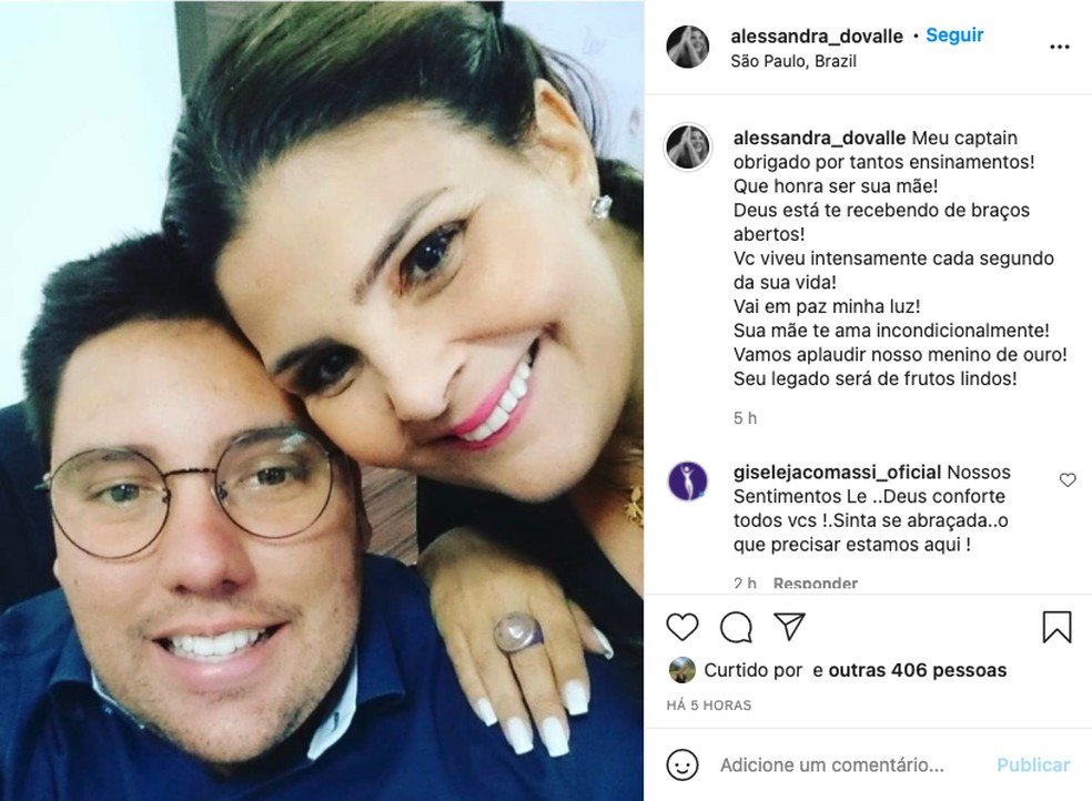 “Meu captain, obrigado por tantos ensinamentos! Que honra ser sua mãe! Deus está te recebendo de braços abertos! Você viveu intensamente cada segundo da sua vida! Vai em paz minha luz!”, escreveu Alessandra em sua conta no Instagram. “Sua mãe te ama incondicionalmente! Vamos aplaudir nosso menino de ouro! Seu legado será de frutos lindos!”, disse a filha do narrador.