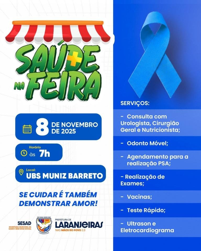 A Secretaria de Saúde de Laranjeiras merece todos os aplausos! O programa Saúde na Feira, realizado no último sábado (8), foi um verdadeiro sucesso — com foco especial na saúde masculina e no combate ao câncer de próstata.