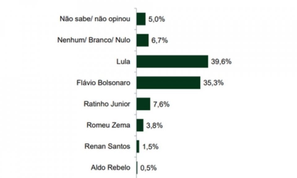 No cenário estimulado de primeiro turno, Lula registra 39,6% das intenções de voto, enquanto Flávio Bolsonaro aparece com 35,3%.