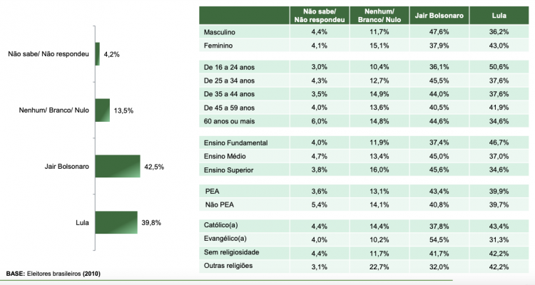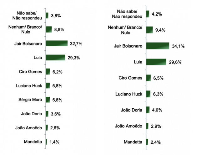 Na primeira projeção para o segundo turno, Bolsonaro e Lula se enfrentam. O atual presidente tem 42,5%, enquanto o petista aparece com 39,8%. A diferença entre os dois opositores tem diminuído desde julho de 2020, quando Bolsonaro registrava 45,6% e Lula, 36,4%. Em dezembro de 2020, o chefe do Executivo computava 47,0% contra 33,4% do ex-presidente. Em janeiro de 2021, Bolsonaro caiu para 42,4% e Lula subiu para 35,7%. Na disputa entre Lula e Ciro Gomes, ex-presidente (38,6%) aparece com 10 pontos na frente do do pedetista (28,1%).