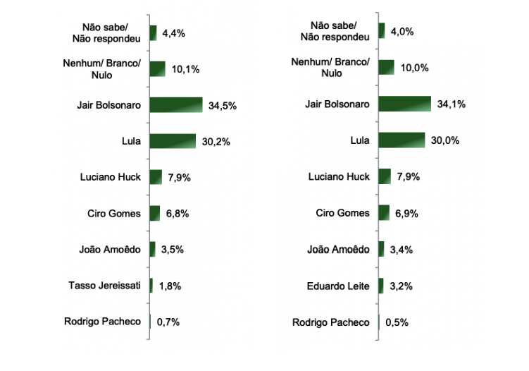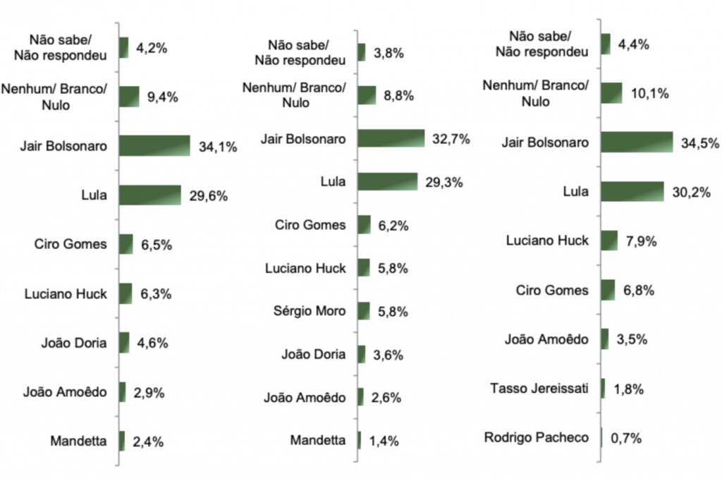 Entre os outros nomes apresentados, estão o do Ciro Gomes (PDT), do apresentador Luciano Huck, do ex-ministro Sergio Moro, do governador de São Paulo, João Doria (PSDB), de João Amoêdo (Novo), do ex-ministro da Saúde Luiz Henrique Mandetta, do senador Tasso Jereissati (CE-PSDB), do presidente do Senado, Rodrigo Pacheco (DEM) e do governador do Rio Grande do Sul, Eduardo Leite (PSDB). Além de Lula e Bolsonaro, nenhum outro possível candidato obteve mais que 8% das intenções de voto.