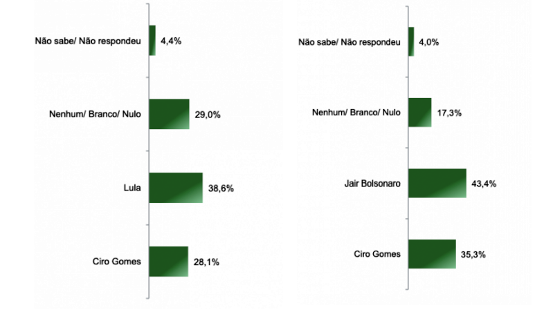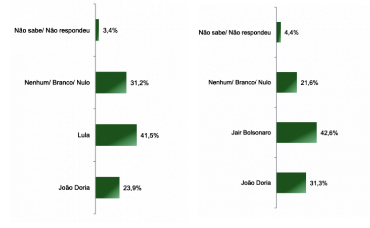 No terceiro cenário de segundo turno, Bolsonaro registra 43,4% e Ciro, 35,3%. Na penúltima projeção, Lula e Doria protagonizam a maior diferença entre os candidatos: o petista fica com 41,5% e o governador de São Paulo, com 23,9%. Na disputa entre os atuais adversários políticos, Bolsonaro obtém 42,6%, enquanto Doria fica com 31,3%. Na comparação com levantamentos anteriores, Doria tem ganho apoio e Bolsonaro tem visto sua influência diminuir. Mesmo assim, a discrepância entre os candidatos continua grande. O Instituto Paraná Pesquisas ouviu 2010 eleitores com 16 anos ou mais. As consultas foram feitas por telefone, entre os dias 30 de abril a 04 de maio de 2021, em 26 Estados e Distrito Federal e em 198 municípios brasileiros. O grau de confiança é de 95%, com margem de erro estimada em e 2% para os resultados gerais.