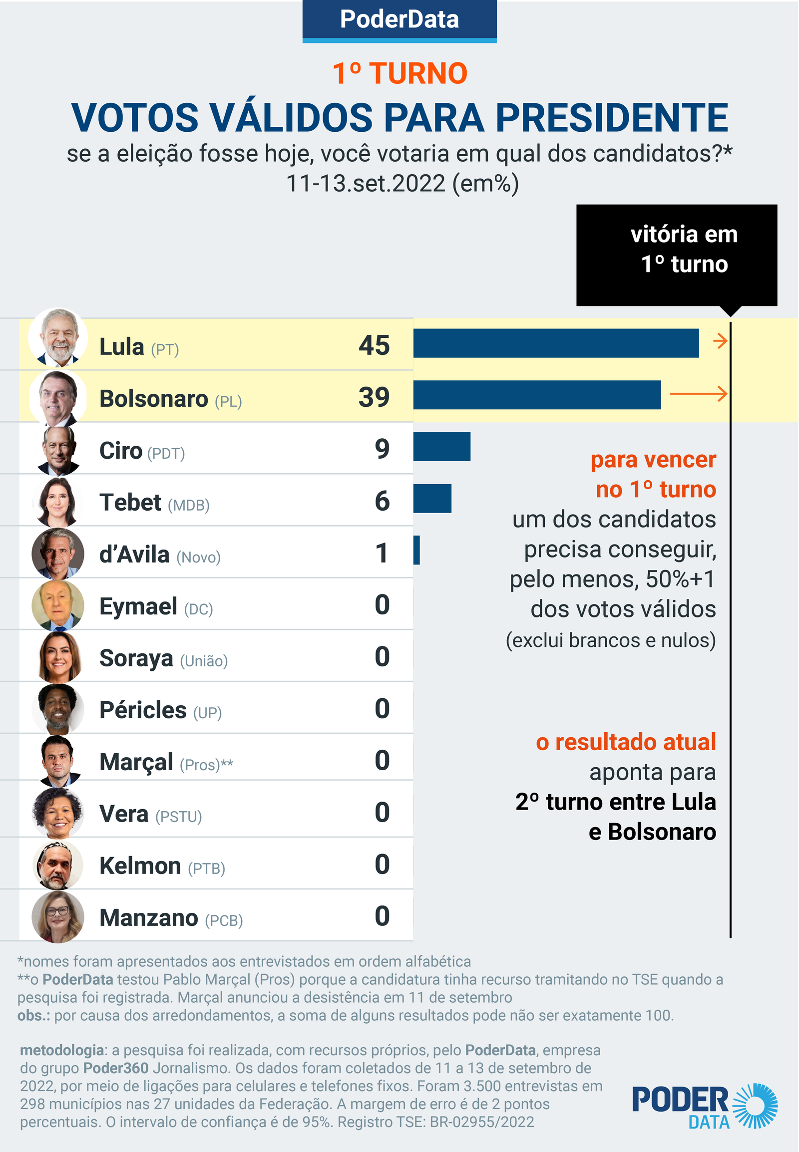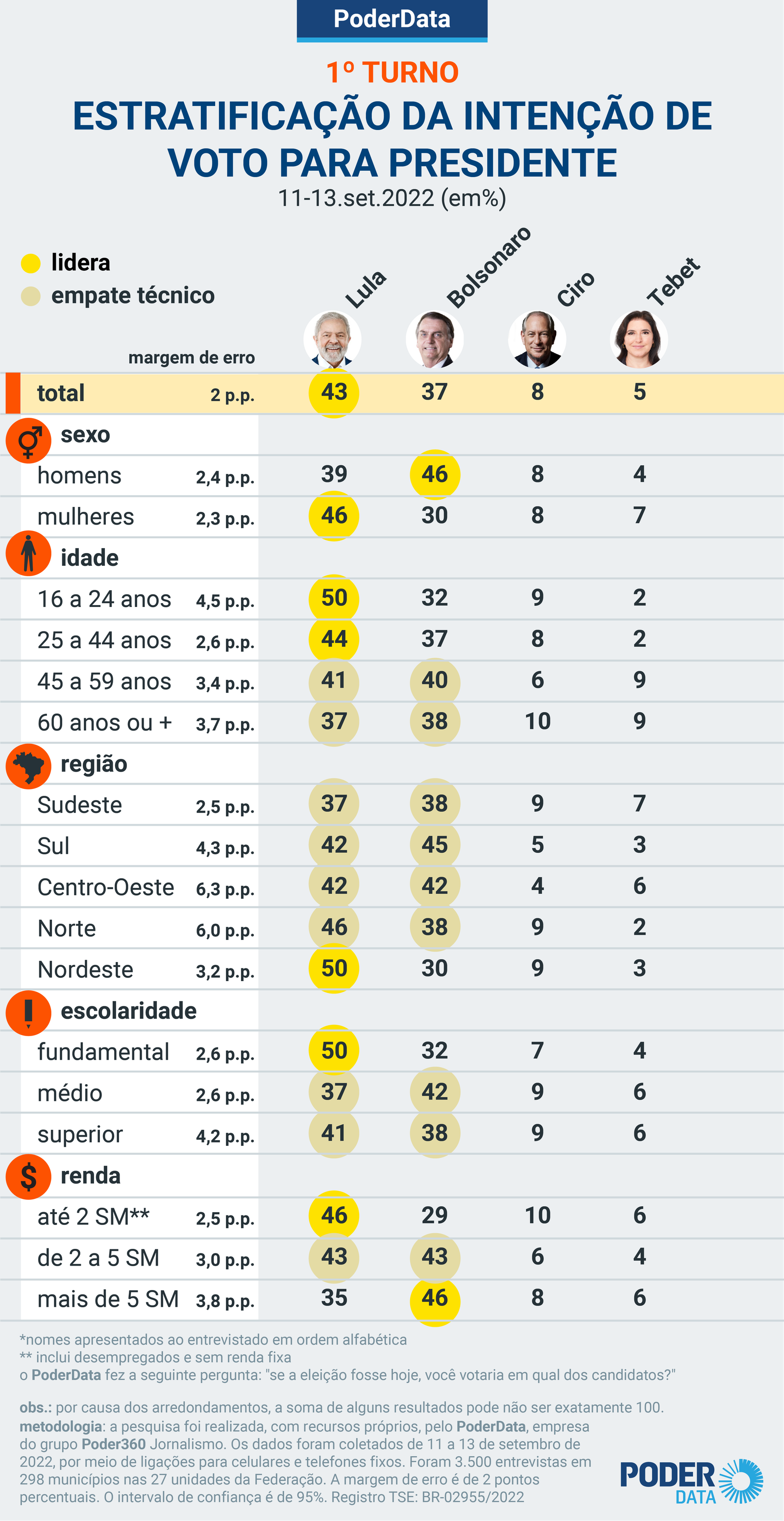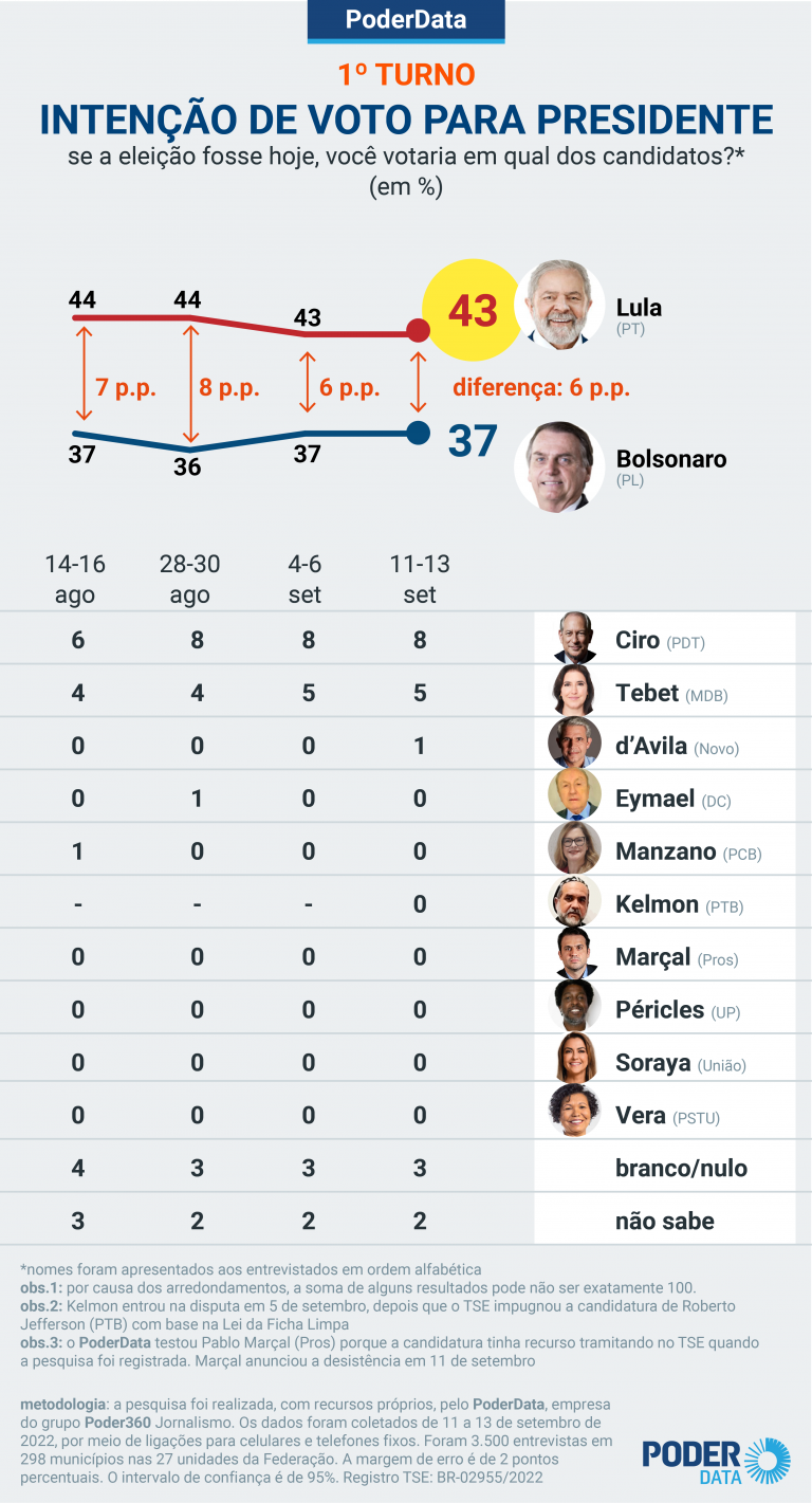 Pesquisa PoderData realizada de 11 a 13 de setembro de 2022 mostra que o cenário de intenção de votos para o 1º turno da sucessão presidencial ficou praticamente imóvel em uma semana. Lula (PT) lidera com 43%; Jair Bolsonaro (PL) tem 37%. As taxas são as mesmas da rodada anterior do PoderData. A diferença entre os 2 está em 6 pontos percentuais.