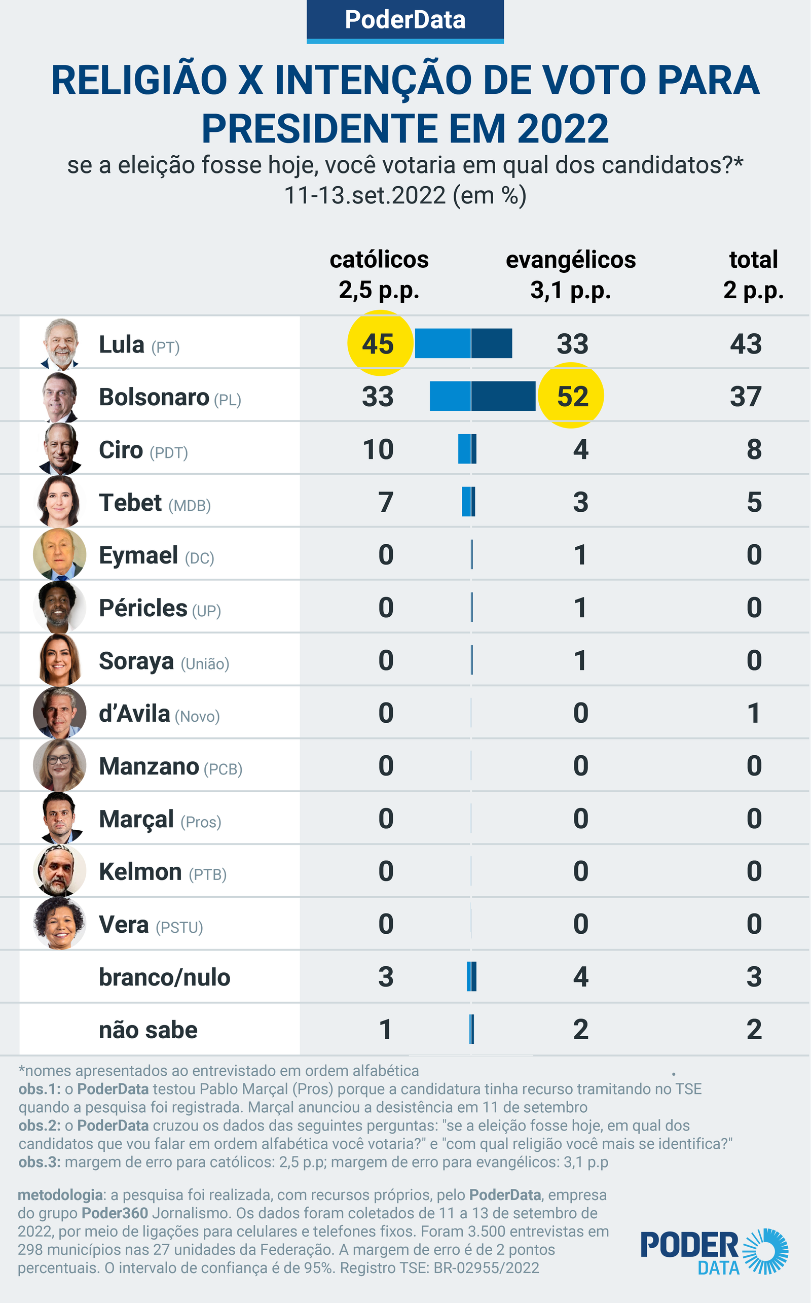 A pesquisa foi realizada pelo PoderData, empresa do grupo Poder360 Jornalismo, com recursos próprios. Os resultados são divulgados em parceria editorial com a TV Cultura. Os dados foram coletados de 11 a 13 de setembro de 2022, por meio de ligações para celulares e telefones fixos. Foram 3.500 entrevistas em 298 municípios nas 27 unidades da Federação. A margem de erro é de 2 pontos percentuais. O intervalo de confiança é de 95%. O registro no TSE é BR-02955/2022.