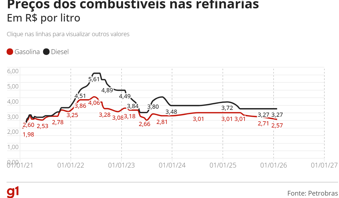 No caso do diesel, a Petrobras informou que não haverá mudança nos preços neste momento. Ainda assim, a companhia destacou que, desde dezembro de 2022, o combustível registra uma redução acumulada de 36,3%, já ajustada pela inflação.