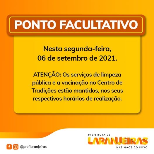 A divulgação do ponto facultativo em Laranjeiras foi realizada inicialmente por meio das redes sociais da Prefeitura. Com o ponto facultativo os servidores do município de Laranjeiras, assim como os do Estado terão feriadão. Com o feriado de 07 de setembro, o retorno ao trabalho só ocorrerá na próxima quarta-feira, dia 08.