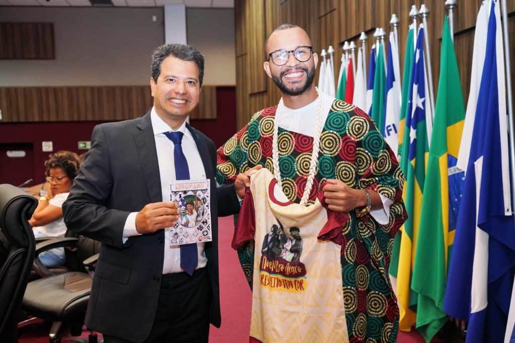 Promotor de Justiça, Dr. Julival recebendo do secretário Gabriel Lourenço o kit oficial do Novembro Negro