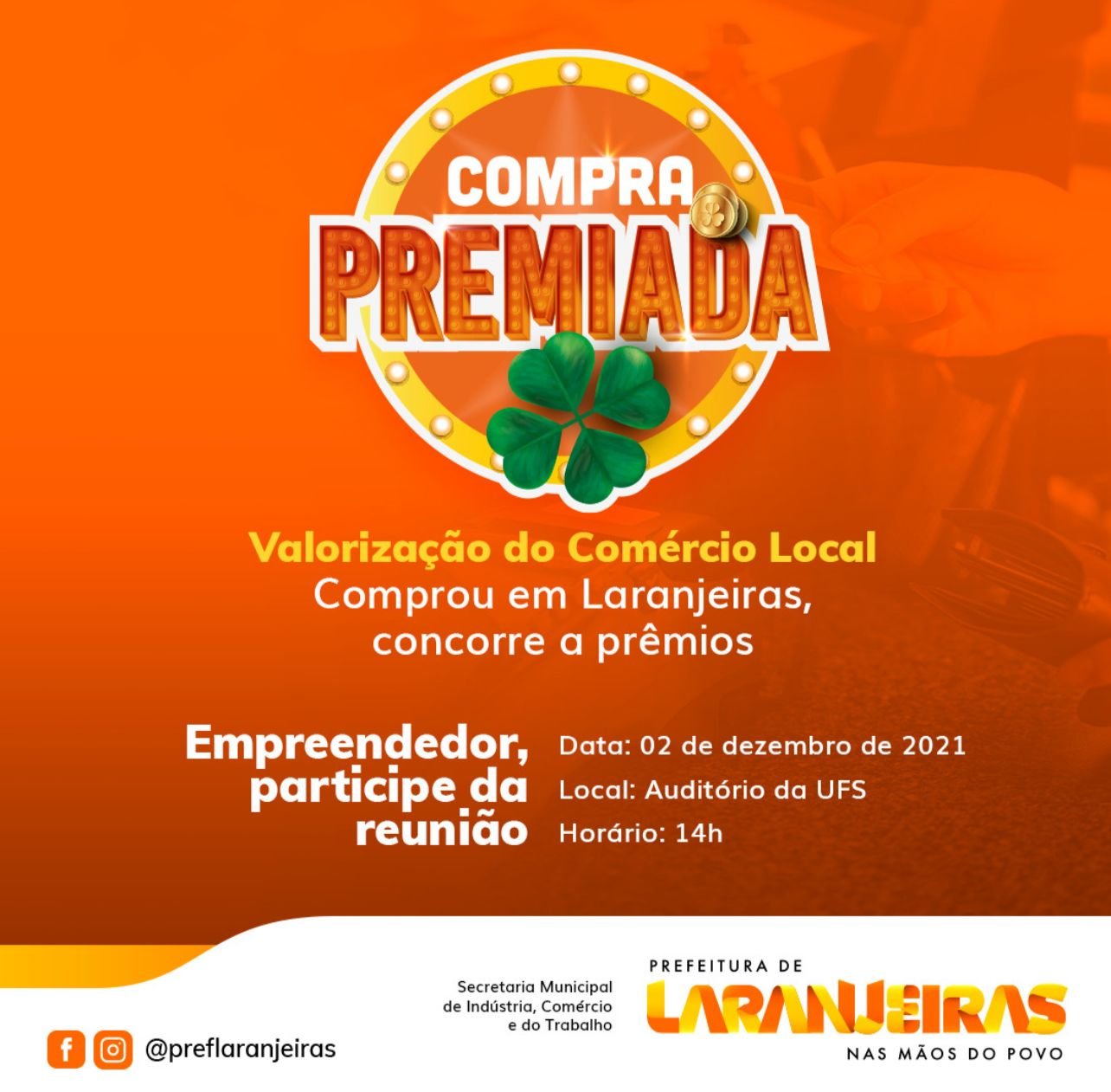 O vice-prefeito e secretário de Indústria, Comércio e Trabalho Janio Dias disse que ”o principal objetivo da campanha ‘Compra Premiada’ é fortalecer o comércio local nesse período de final de ano quando as famílias são estimuladas para fazer suas compras. Serão investidos mais de 10 mil reais em prêmios nos sorteios da campanha. De 09 de dezembro até 09 de janeiro, toda compra a partir de 30 reais realizada nas casas comerciais de Laranjeiras, que estiverem cadastradas na campanha receberá o cupom para concorrer aos prêmios”, explicou Janio.