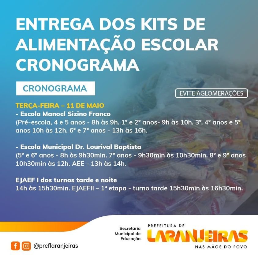 Nesta terça (11), os trabalhos serão retomados com a entrega nas escolas Manoel Sizino Franco e Lourival Baptista. Na quarta, quinta e sexta, serão beneficiados também os estudantes das escolas Maria Regina de Oliveira, Creche Maria Carmita Fernandes, Dom Pedro II, Leonídio Leite, Creche Bruna Hagenbeck e Alcino Manoel Prudente. Para ter acesso ao cronograma completo é preciso acessar as redes sociais da Prefeitura, no Facebook e Instagran (@preflaranjeiras). Todos os dias são feitas postagens com essa e outras novidades das ações da gestão municipal.