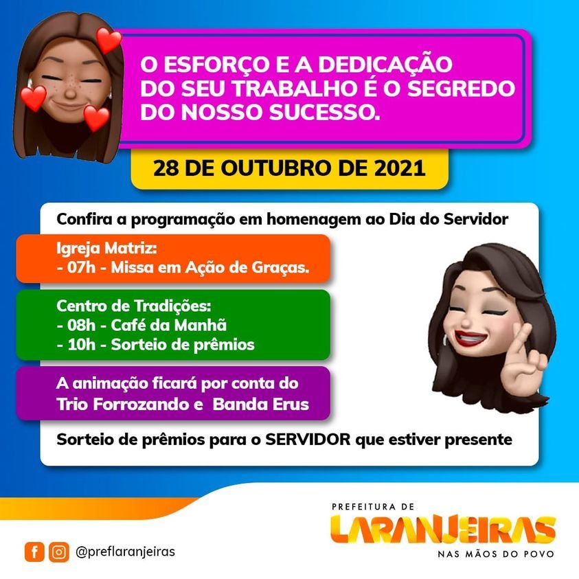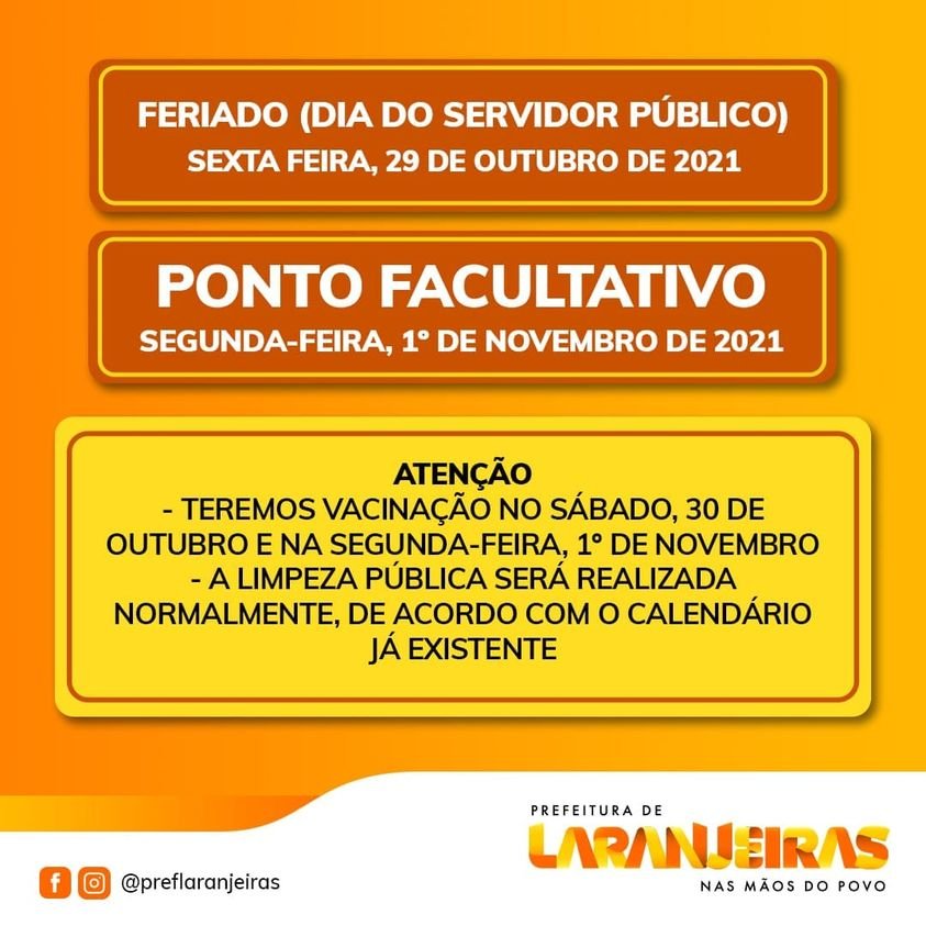 Os servidores municipais em Laranjeiras terão vários motivos para festejar o dia do servidor público. Além da programação festiva que acontece neste quinta, 28, repercutida com aqui na matéria, existe também a decretação de ponto facultativo nos dia 29 de outubro (sexta-feira) e na segunda, 1º de novembro, lembrando que na terça-feira, 02. é feriado ncional dedicado ao dia de finados. Sendo assim, os servidores públicos da Prefeitura de Laranjeiras terão excelente feriadão!