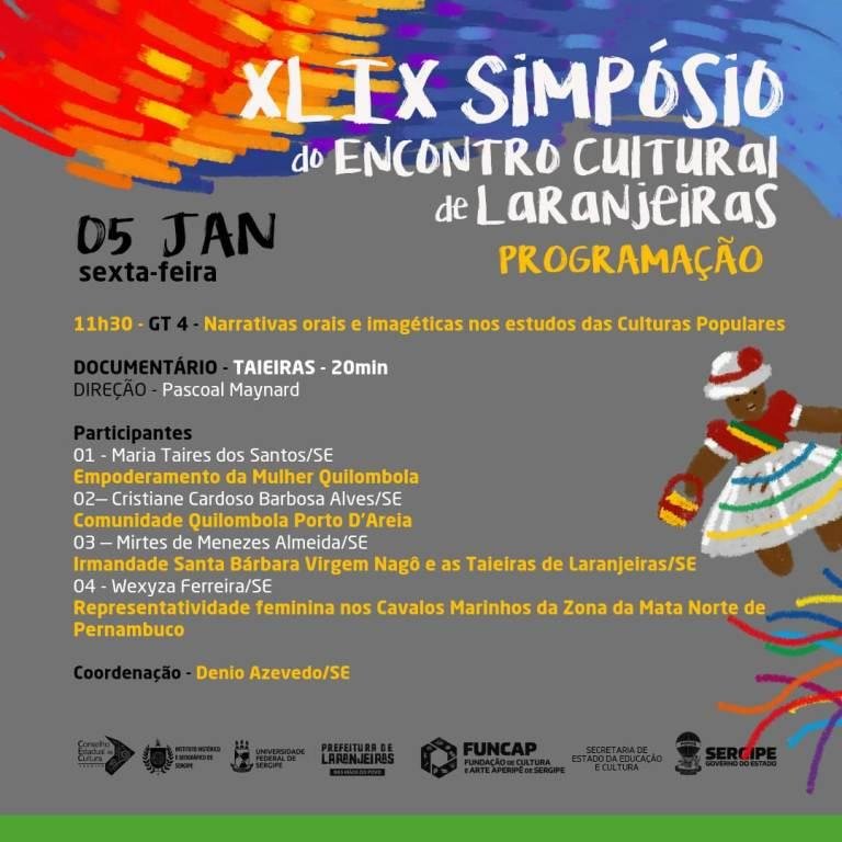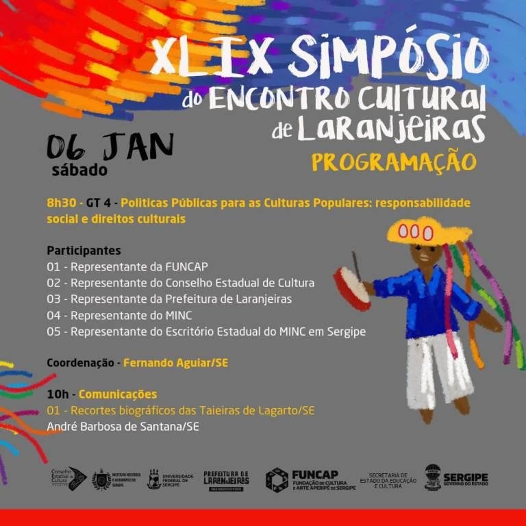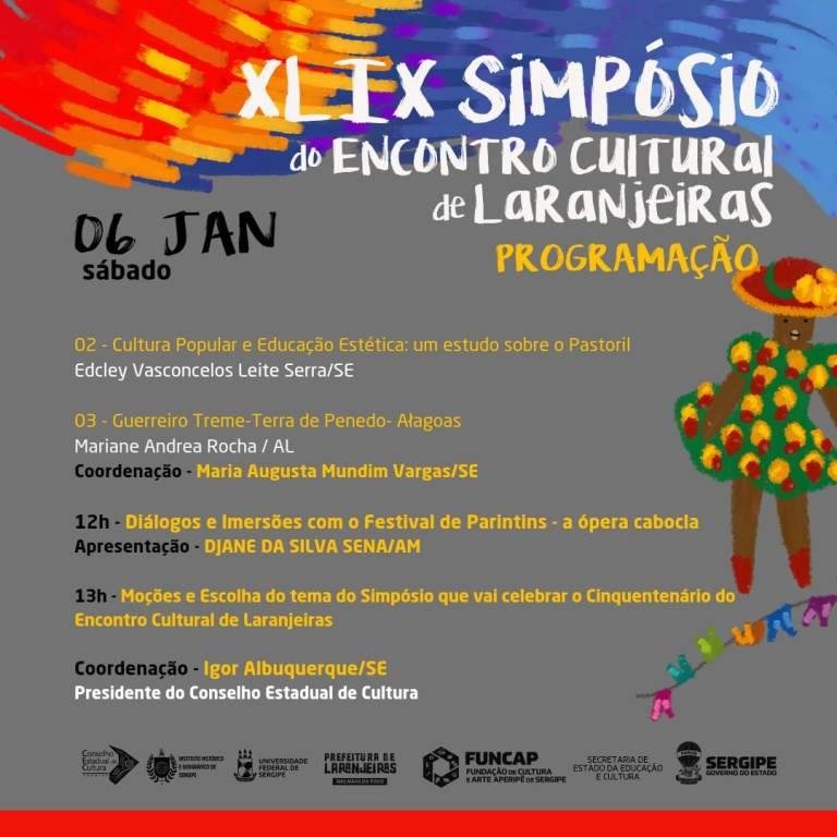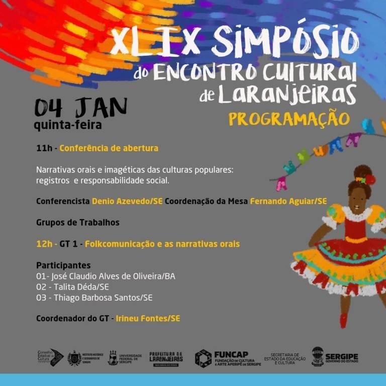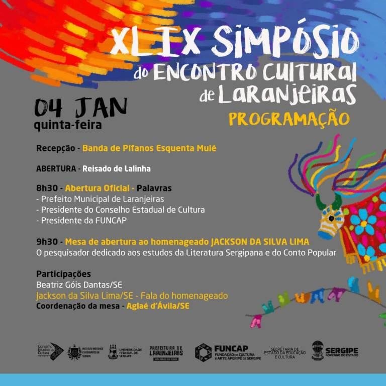 Com o tema ‘Narrativas orais e imagéticas das culturas populares: registros e responsabilidade social’, o evento busca promover discussões enriquecedoras sobre as práticas culturais e experiências vivenciadas. O Simpósio do Encontro Cultural de Laranjeiras é uma realização do Governo de Sergipe, por meio da Fundação de Cultura e Arte Aperipê (Funcap), em parceria com a Universidade Federal de Sergipe (UFS), o Instituto Histórico e Geográfico de Sergipe (IHGSE), o Conselho Estadual de Cultura (CEC) e com o apoio da Prefeitura de Laranjeiras.