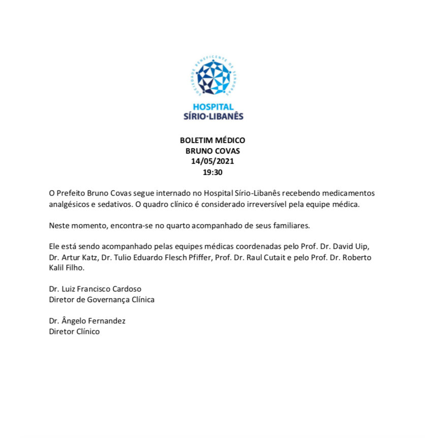 “O Prefeito Bruno Covas segue internado no Hospital Sírio-Libanês recebendo medicamentos analgésicos e sedativos. O quadro clínico é considerado irreversível pela equipe médica. Neste momento, encontra-se no quarto acompanhado de seus familiares”, informou o boletim.