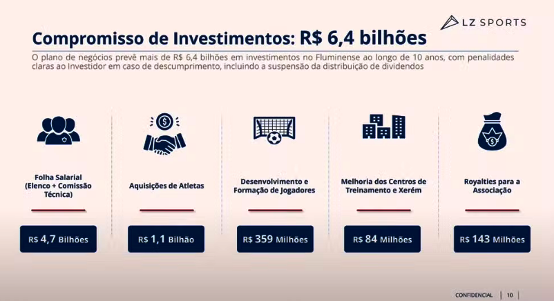 O grupo de empresários reunido pela LZ Sports trata a aquisição do Fluminense SAF como um projeto de longo prazo e sem foco no lucro imediato. Até por isso, nenhum dividendo será distribuído aos acionistas até que a obrigatoriedade de R$ 6,4 bilhões de investimento seja cumprida. A distribuição do lucro só acontecerá se todas as metas, inclusive esportivas, forem cumpridas.