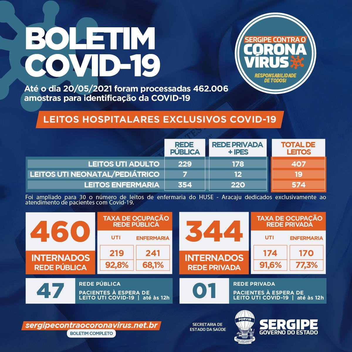 Foram realizados 462.006 exames e 240.464 foram negativados. Estão internados 804 pacientes, sendo que no serviço público são 214 em leitos de UTI (adulto), cinco na UTI neonatal/ pediatria e 241 em leitos clínicos (enfermaria), totalizando 460. Já nos leitos do serviço privado estão internados 171 pessoas na UTI adulta, três na UTI neonatal/ pediatria e 170 em leitos clínicos, totalizando 344. São investigados mais 15 óbitos. Ainda aguardam resultados 7.815 exames coletados.