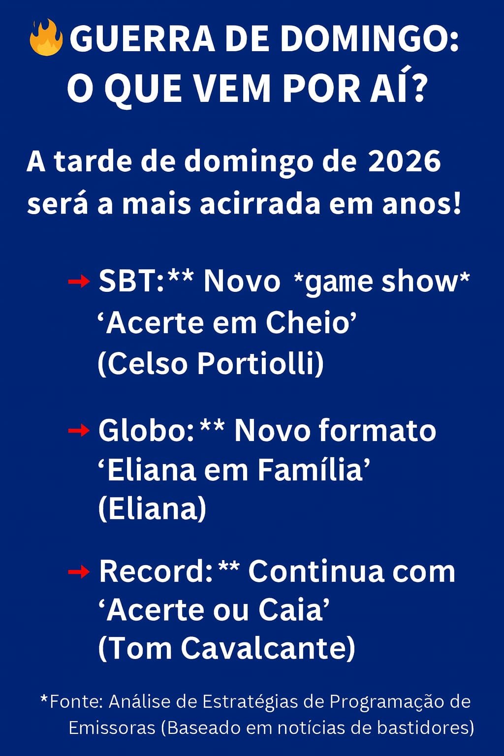 A Globo lançará o Eliana em Família nas tardes de domingo, enquanto a Record continuará apostando no Acerte ou Caia, comandado por Tom Cavalcante.