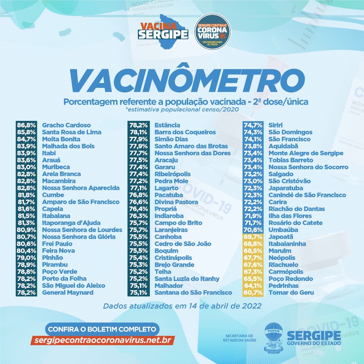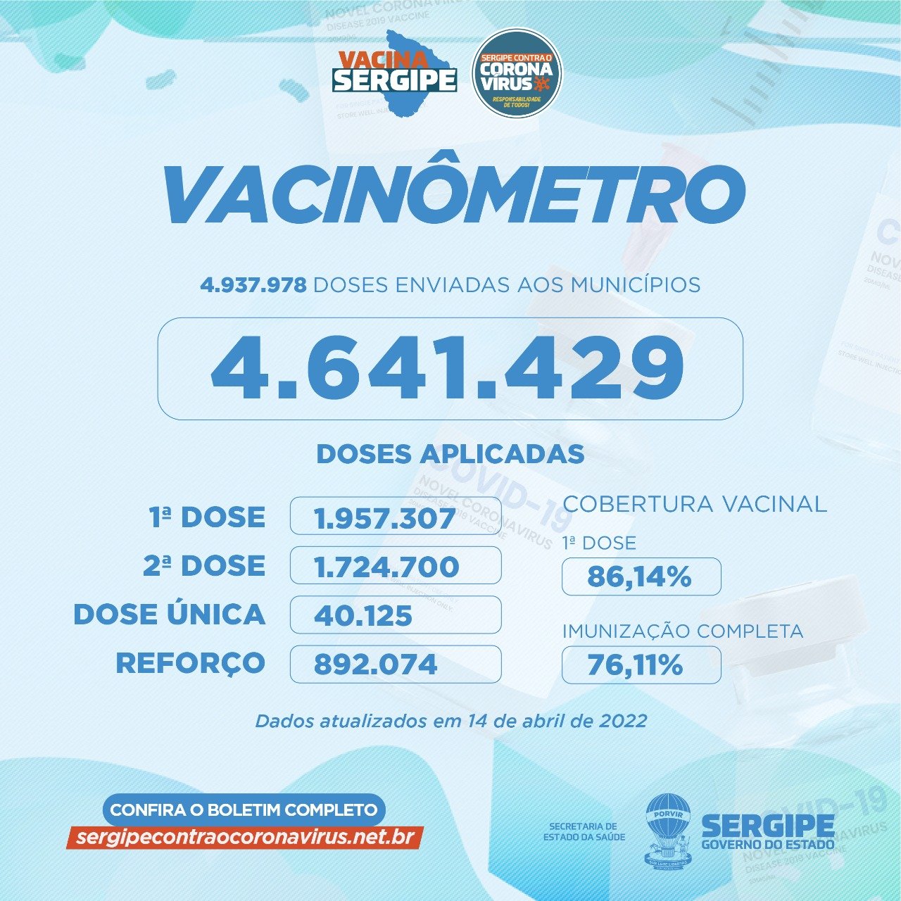 Foram enviadas aos municípios 4.937.978 doses. Destas, 1.957.307 foram aplicadas como primeira dose; 1.724.700 como segunda dose; 40.125 como dose única e 892.074 como dose de reforço. A cobertura vacinal de primeira dose está em 86,14% e 76,11% estão com a imunização completa.