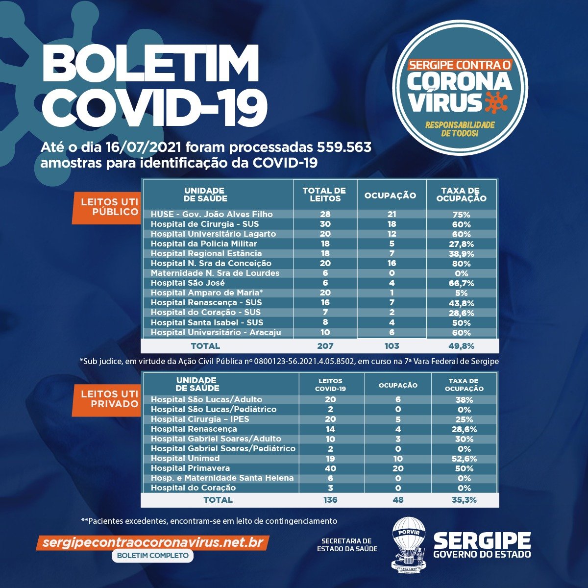 As sete mortes foram: uma mulher, 64 anos, de Aracaju, com câncer, obesidade e hipertensão; uma mulher, 94 anos, de Aracaju, sem comorbidade; um homem, 52 anos, de Simão Dias, sem comorbidade; um homem, 47 anos, de Aracaju, sem comorbidade; um homem, 71 anos, de Aracaju, sem comorbidade; uma mulher, 27 anos, de Itabaiana, com diabetes, puérpera e com hipertensão; uma mulher, 76 anos, de Lagarto, com insuficiência renal aguda.