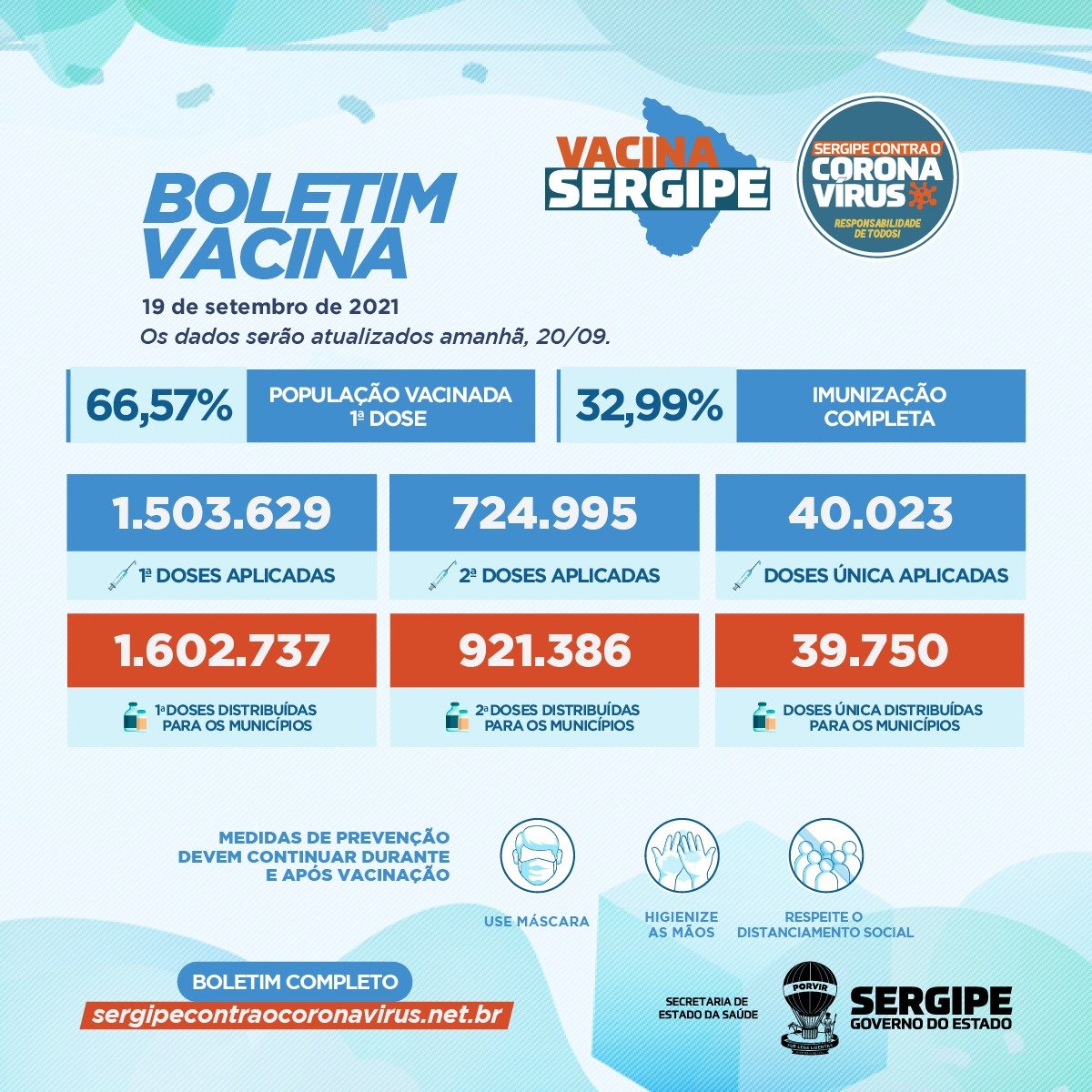 Foram entregues aos municípios como primeiras dose 1.602.737 vacinas e 1.503.629 foram aplicadas. Para segundas dose foram entregues 921.386 e aplicadas 724.995. Em relação às doses única foram distribuídas 39.750 e aplicadas 40.023.