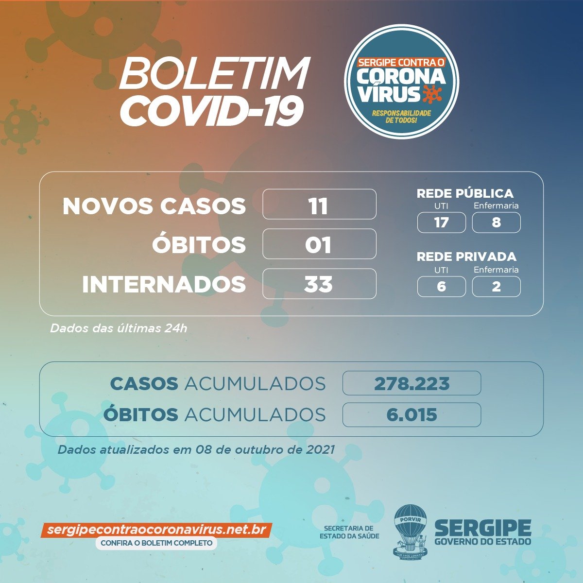 A Secretaria de Estado da Saúde, através do boletim epidemiológico, informa que nesta sexta-feira (08), foram registrados 11 novos casos de Covid-19. No total, 278.223 pessoas testaram positivo para a doença e 6.015 morreram. O óbito que estava em investigação e foi confirmado é uma mulher, 88 anos, de Pacatuba, com hipertensão, acidente vascular cerebral e tabagismo.